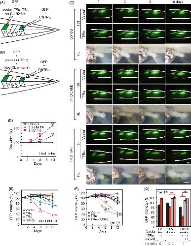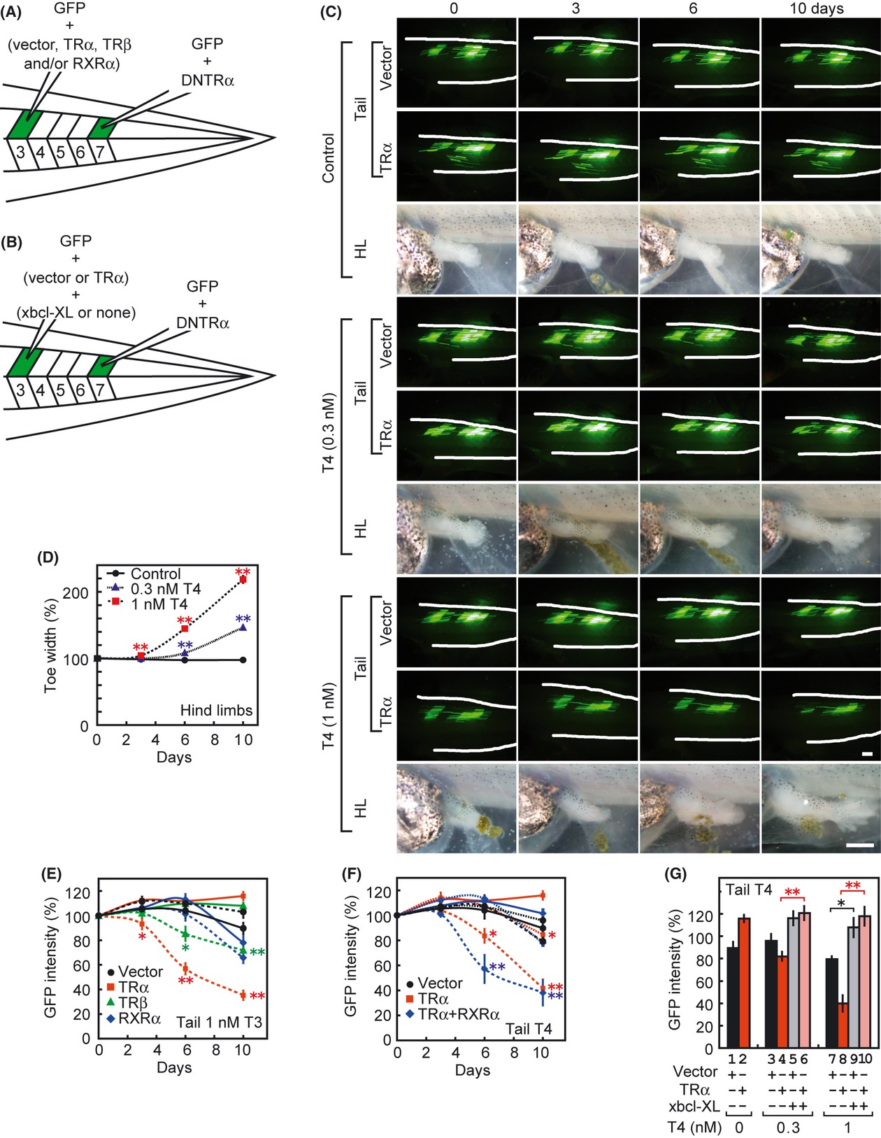 Figure 2: Thyroid hormone receptor (TR)-transfected tail muscle cells die in response to low levels of TH. (A) The schema shows the injection protocol for the experiments in (CâF) and Fig. S1A,C in Supporting Information. The empty vector, TRα, TRβ, and/or RXRα expression constructs (25 ng each) were injected with a GFP reporter gene (25 ng) into the third tail myomere of NF-stage 53â54 methimazole-treated tadpoles, and the GFP and dominant negative thyroid hormone receptor α (DNTRα) genes (25 ng each) were injected into the seventh myomere. The numbers of myomeres are indicated. (B) The injection protocol for the experiment in (G). (C) Representative photographs of the hind limbs (HL) and the GFP fluorescence of tadpole tails injected with a vector or the TRα expression construct. T4 treatment induced the reduction in GFP fluorescence in the TRα-injected myomeres. The white lines trace the contours of tails other than fins. Scale bars, 1 mm. (D) The response of hind limbs to 0 nm (circle, solid line), 0.3 nm (triangle, thin dotted line), or 1 nm T4 (square, dotted line) treatment. The ratio of the length between the first and the fifth digits measured on the indicated day to the length on day 0 was evaluated. Data are expressed as means ± SE. (n = 59â110). **Significance difference between control and T4-treated hind limbs, determined by Dunnett's test (P < 0.001). (EâG) The ratio of the fluorescence intensity of the third myomere to that of the DNTRα-injected myomere was calculated. The value at the starting point was set to 100%. Data are expressed as means ± SE. (n = 4â24). (E) GFP expression in the tail myomeres injected with the vector (black circle), TRα (red square), TRβ (green triangle), or RXRα (blue diamond) expression construct in the absence (solid line) or presence of 1 nm T3 (dotted line). Statistical significance by comparison with control tail myomeres was assessed using Student's t-test. *P < 0.05; **P < 0.001. (F) GFP expression in the muscle cells transfected with the vector (black circle), TRα (red square), or TRα-RXRα (blue diamond) expression constructs in the presence of 0 nm (solid line), 0.3 nm (thin dotted line) or 1 nm (dotted line) T4. Statistical significance by comparison with control tail myomeres was assessed using Dunnett's test. *P < 0.05; **P < 0.001. (G) The xbcl-XL co-injection suppressed the reduction in GFP fluorescence that was induced by T4 in the TRα-transfected tail muscle cells. The GFP construct (25 ng) and various combinations of expression constructs encoding no protein, TRα, and xbcl-XL (25 ng each) were injected into the third myomere, and the GFP and DNTRα constructs (25 ng each) were injected into the seventh myomere. The combinations of the injected genes and T4 treatments are indicated in the figure. The fluorescence intensity of the GFP signal was examined on days 0 and 10. Statistical significance by comparison with bcl-XL-injected myomeres was assessed using Student's t-test. *P < 0.05; **P < 0.001. NF, Nieuwkoop and Faber; TH, thyroid hormone.