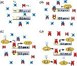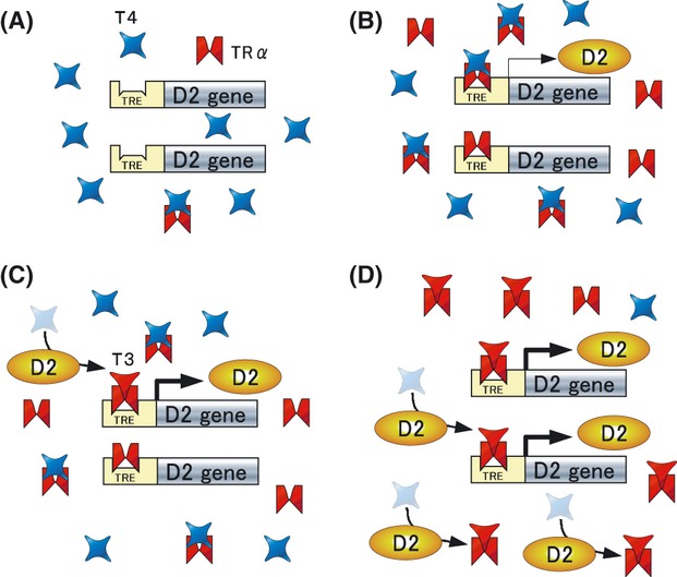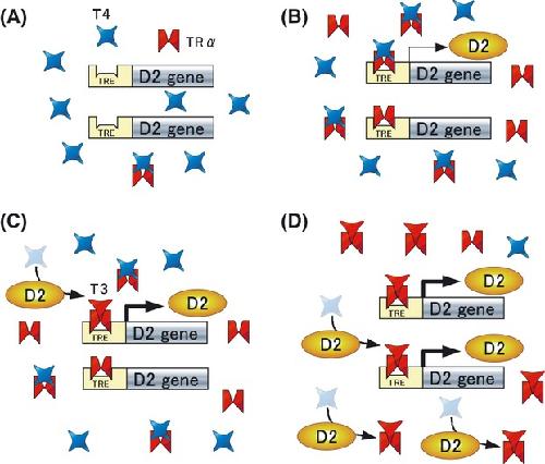 Figure 8: Model of differential tissue sensitivity to thyroid hormone (TH). (A) Thyroid hormone receptor (TRα) protein is not sufficient in tail muscle cells to occupy a low-affinity TH-response element (TRE) of D2 gene promoter at the beginning of prometamorphosis when T4 level is low and T3 is not detectable. (B) Abundant TR can bind D2 TRE in hind limbs and TR-transfected tail muscle cells at the beginning of prometamorphosis. Once a part of TR on D2 TRE makes a complex with T4, D2 gene is stimulated and a small amount of D2 protein is synthesized, leading to the activation of T4 to T3. (C) T3 efficiently binds TR on D2 TRE and forms the stable transcriptional complex in D2 gene promoter to produce more D2 mRNA. (D) High levels of D2 protein convert T4 to T3 and augment TH signaling.