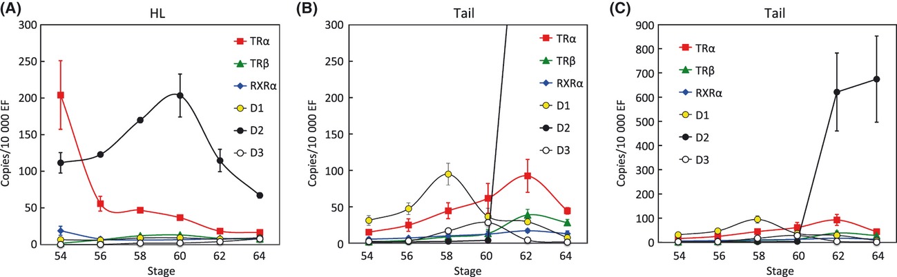 Figure 1: Developmental gene expression profiles during Xenopus laevis spontaneous metamorphosis. mRNA expression levels of thyroid hormone receptor (TRα) (red square), TRβ (green triangle), RXRα (blue diamond), D1 (yellow circle), D2 (closed circle), and D3 (open circle) are shown. Total RNA was extracted from hind limbs (A), and tail (B and C) of 3â6 tadpole siblings at the indicated stages. mRNA levels of metamorphosis-related genes were quantified by RT-PCR and normalized to EF mRNA. Data are shown as means ± SE. (n = 3â7). EF, elongation factor.