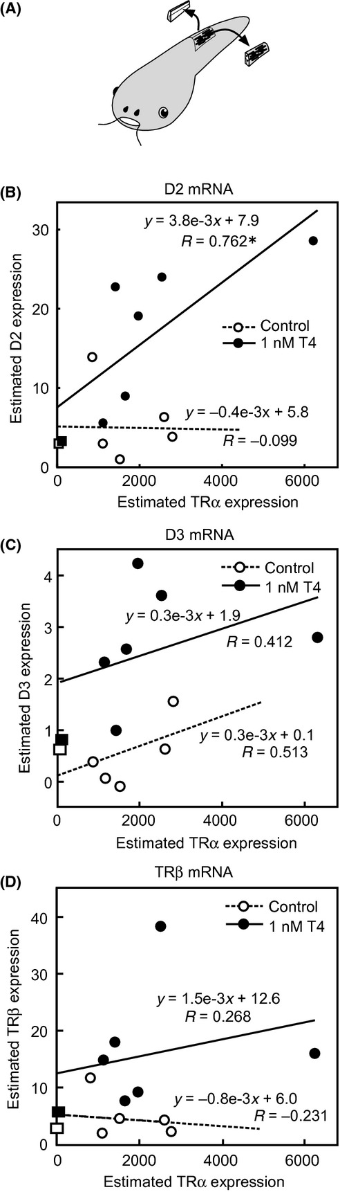 Figure 4: D2 mRNA is induced in the thyroid hormone receptor (TRα)-transfected tail muscle cells in response to a low level of T4. (A) The schema shows the experimental protocol. (BâD) The TRα construct was co-injected with the GFP construct (25 ng each) into both the fifth and sixth myomeres of methimazole-treated tadpole tails. One week after injection, the tadpoles were treated with 1 nm T4 for 0 (open circle) or 4 days (closed circle). Afterward, the TRα-injected and contralateral tail myomeres were dissected out, and the mRNA expression levels of D2 (B), D3 (C), thyroid hormone receptor (TRβ) (D), and TRα in the TRα-overexpressing muscle cells were estimated as described in Experimental procedures. Each point represents a value from more than three tadpoles. The average mRNA expression levels in the contralateral myomeres that were treated for 0 (an open square) and 4 days (a closed square) are plotted at similar positions. Pearson correlation analysis showed significant correlations between expression levels of D2 and TRα in T4-treated tadpoles. *P < 0.05.