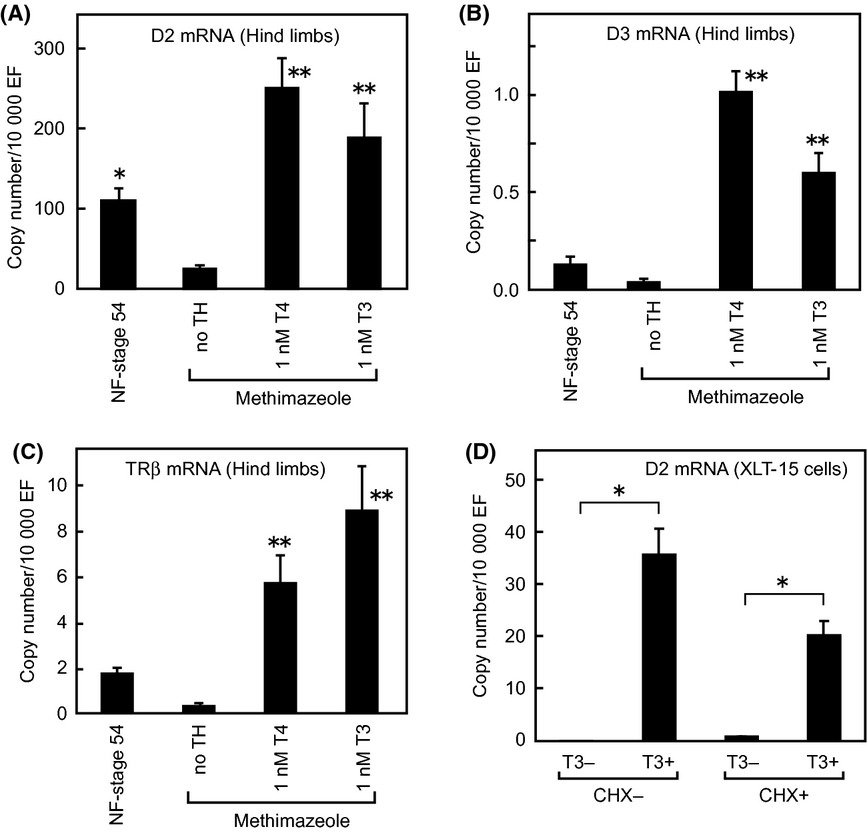 Figure 5: D2 mRNA is induced by thyroid hormone (TH) in hind limbs and directly in a cultured cell line. (AâC) RT-PCR was performed using the total RNA that was isolated from hind limbs (more than five tadpoles per group). Nieuwkoop and Faber (NF)-stage 51â52 tadpoles were treated with 1 mm methimazole for more than 24 days and were reared in the absence (no TH) or presence of 1 nm TH (1 nm T4 or 1 nm T3) for 7 days. Hind limbs of NF-stage 54 tadpoles were used as a control. The copy numbers of D2 (A), D3 (B), and TRβ (C) mRNAs per 10 000 copies of elongation factor (EF) mRNA are shown as means ± SE. (n = 5â12). Statistical significance by comparison with control (no TH) hind limbs was assessed using KruskalâWallis followed by Dunnett's test. *P < 0.05; **P < 0.001. (D) TH directly induced D2 mRNA expression. RT-PCR was performed using the total RNA that was isolated from XLT-15 cells treated with or without 10 nm T3 for 8 h in the absence or presence of a protein synthesis inhibitor (10 μg/mL cycloheximide [CHX]). The copy number of D2 mRNA per 10 000 copies of EF mRNA is shown as the mean ± SE. (n = 3). Statistical significance by comparison with control (T3-) cells was assessed using Student's t-test. *P < 0.05. TR, thyroid hormone receptor.