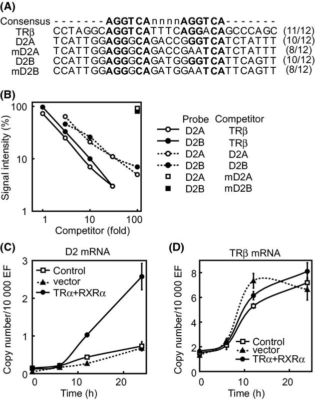 Figure 6: D2 TH-response element (TREs) have a lower affinity for thyroid hormone receptor (TR) compared with the TRβ TRE. (A) The sequences of the consensus TRE, Xenopus laevis TRβ TRE, D2 TREs, and mutated D2 TREs. Bold nucleotides indicate identity with the consensus motif. The homology of each TRE to the consensus TRE is shown in parentheses. (B) Gel mobility shift assays were performed using the D2A TRE (open circle) or D2B TRE (closed circle) as a radiolabeled probe with cold TREs. The cold TRβ TRE (solid line) was a better competitor than either of the cold X. laevis D2 TREs (dotted line) for TR/RXR binding of labeled TREs. The complex of TR/RXR with radiolabeled D2A and D2B TREs was not reduced by the addition of a 100-fold excess of cold mD2A (open square) and mD2B (closed square) TREs, respectively. (C,D) D2 mRNA was more effectively induced by TH in the TRα-overexpressing cells. XLT15-9 cells were transfected with 250 ng of xbcl-XL and 125 ng of RXRα and TRα (closed circle, solid line) or 250 ng of the vector (closed triangle, dotted line); 2 days later, they were treated with 1 nm T3 for the indicated times. The untransfected cells were also treated with T3 (open square, solid line). The copy numbers of D2 (C) and TRβ (D) mRNA per 10 000 copies of EF mRNA are shown as the means ± SE. of three experiments. EF, elongation factor; TH, thyroid hormone.
