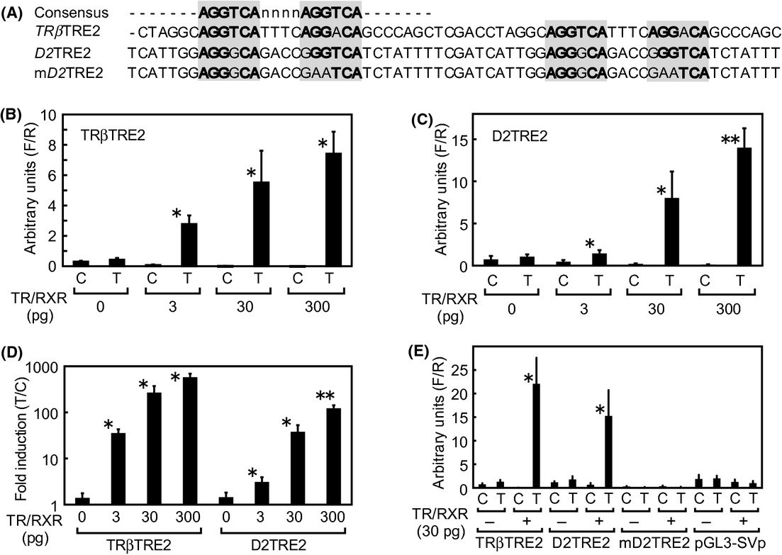 Figure 7: D2 TH-response element (TRE) is functional in the oocyte system. (A) Sequence comparison of the TREs of the expression constructs TRβTRE2, D2TRE2, and mD2TRE2 with the consensus TRE. Bold nucleotides indicate identity with the consensus motif. (BâD) The mRNAs for thyroid hormone receptor (TRα) and RXRα (3, 30 or 300 pg/oocyte each) were injected into the cytoplasm of oocytes. The firefly luciferase reporter vector TRβTRE2 (B,D) or D2TRE2 (C,D) was injected into the nucleus together with the control Renilla luciferase plasmid. The oocytes were treated without or with 100 nm T3. After an overnight incubation, the oocytes were harvested for the dual-luciferase assay. Each oocyte was used for a luciferase assay. The ratio of the firefly luciferase activity in the TRβTRE2- or D2TRE2-injected oocytes to the control Renilla luciferase activity was determined (F/R) (B,C). The relative luciferase activities of the T3-treated samples were calculated as the fold luciferase activity, with onefold activity defined as the luciferase activity in the samples that were not subjected to the T3 treatment (D). Data are expressed as means ± SE. (n = 4â8). (E) A mutant version of D2TRE2 was not functional. The oocytes were injected without (â) or with (+) 30 pg/oocyte TRα and RXRα mRNAs followed by an injection of the luciferase reporter TRβTRE2, D2TRE2, mD2TRE2, or the expression vector together with the Renilla luciferase plasmid. After an overnight incubation in the absence or presence of 100 nm T3, the oocytes were harvested for the dual-luciferase assay. The firefly luciferase activity was normalized to the Renilla luciferase activity (F/R). Data are expressed as means ± SE. (n = 5â9). C and T indicate 0 and 100 nm T3, respectively. Statistical significance by comparison with control oocytes was assessed using Student's t-test. *P < 0.05; **P < 0.001.
