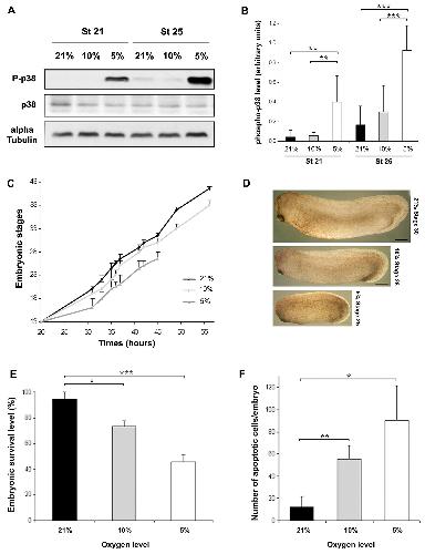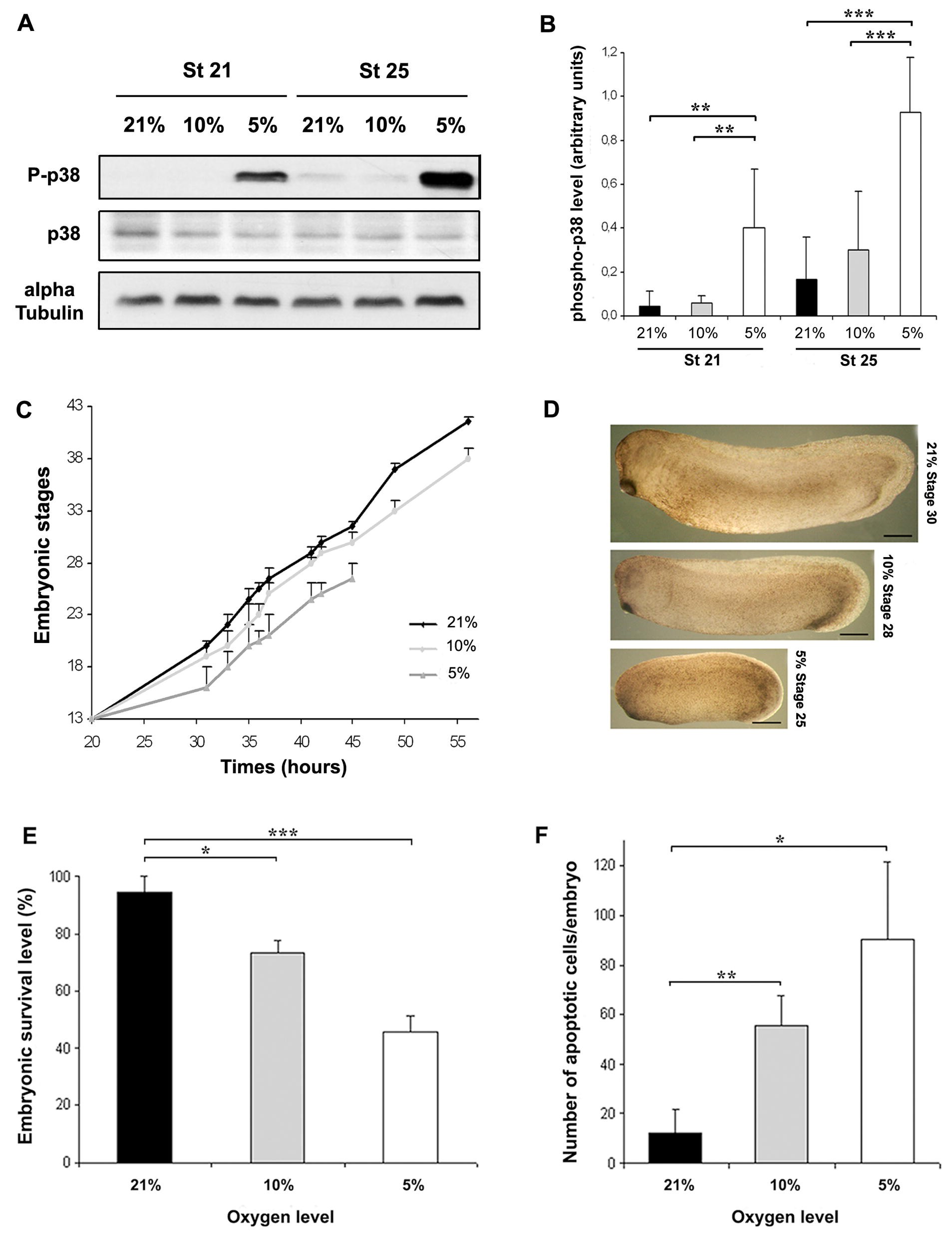 conditions as described in material and method. (C) Growth of embryos at 21 in functions of time and of oxygen rate. Less oxygen is available more the retardation is important and hypoxic embryos maintained their delay. (D) Lateral view of embryos 42 hours after fertilization. When control embryos were stage 30, embryos exposed to 10% O2 were stage 28 and embryos exposed to 5% O2 were stage 25. (E) Embryo survival in function of oxygen level. Moderate hypoxia permits survival but strong hypoxia causes significant embryonic death. (F) Stage 25 embryos were sectioned (n=15) and TUNEL stained. Positive cells werecounted on frontal sections of control and hypoxic embryos. The average of positive cells per embryos is compared on the graph. Apoptosis was promoted with hypoxia. *P<0.05; **P<0.005; ***P<0.001. Scale bar = 400 μm.