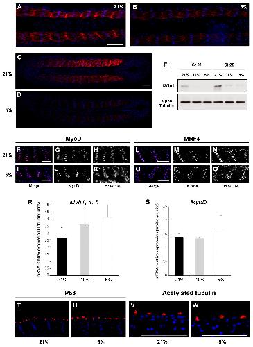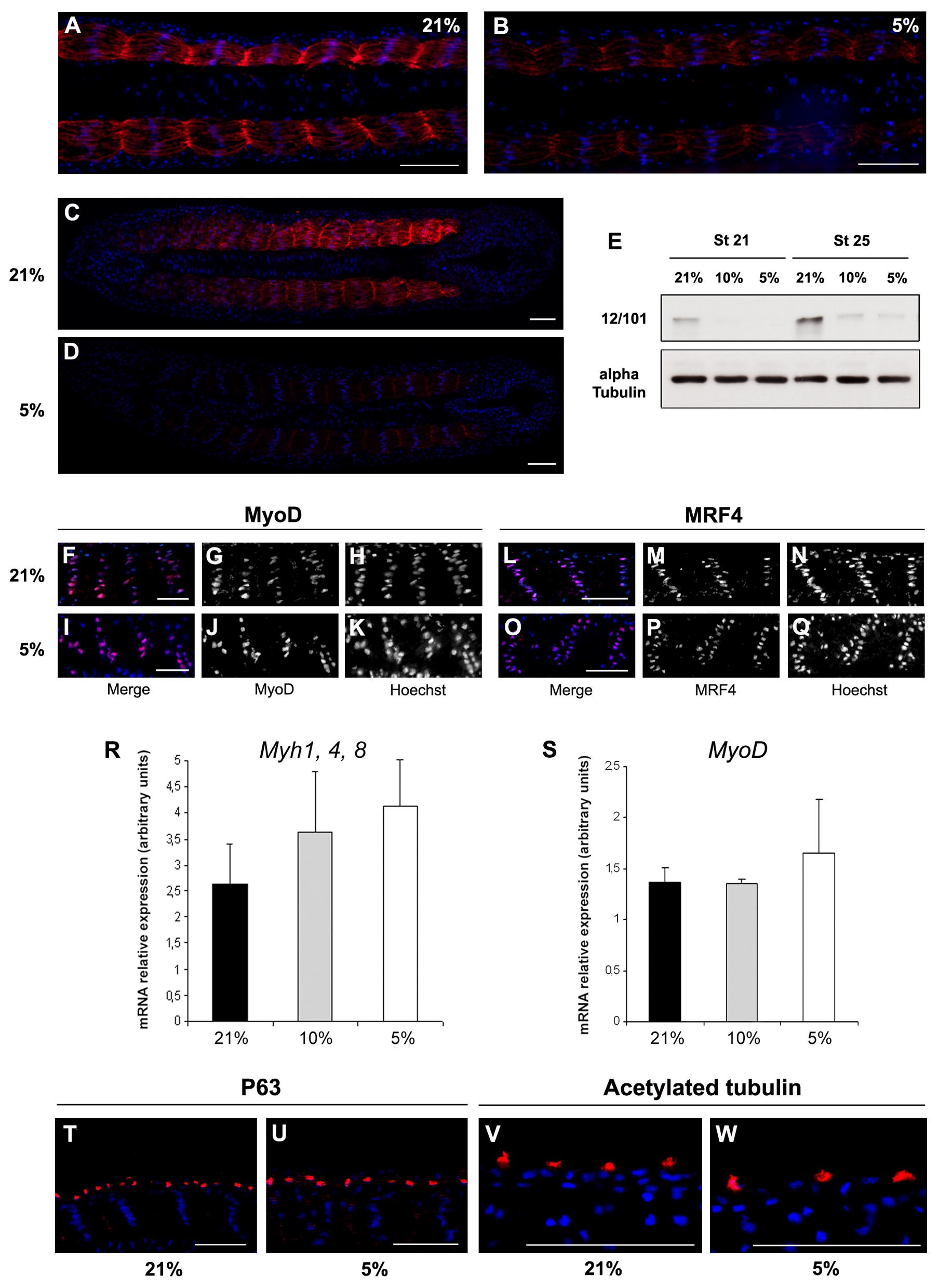 No significant differences in the localisation and expression of MyoD and MRF4 were detected. (R-S) qRT-PCR of Myh 1, 4 and 8 mRNAs (R) and MyoD mRNA (S) in normoxia (21% O2) and hypoxia (10 and 5% O2) at stage 25. The amount of mRNAs remained constant regardless of oxygen availability. (T-W) Stage 25, 21% and 5% O2-exposed embryos, sectioned and stained with Hoechst (blue) and immunostained with the anti-P63 (red; T,U) and anti-acetylated tubulin antibodies (red; V, W). P63 was still expressed in nuclei of cells and acetylated tubulin in ciliated cells of the epidermis. Scale bar = 100 μm.