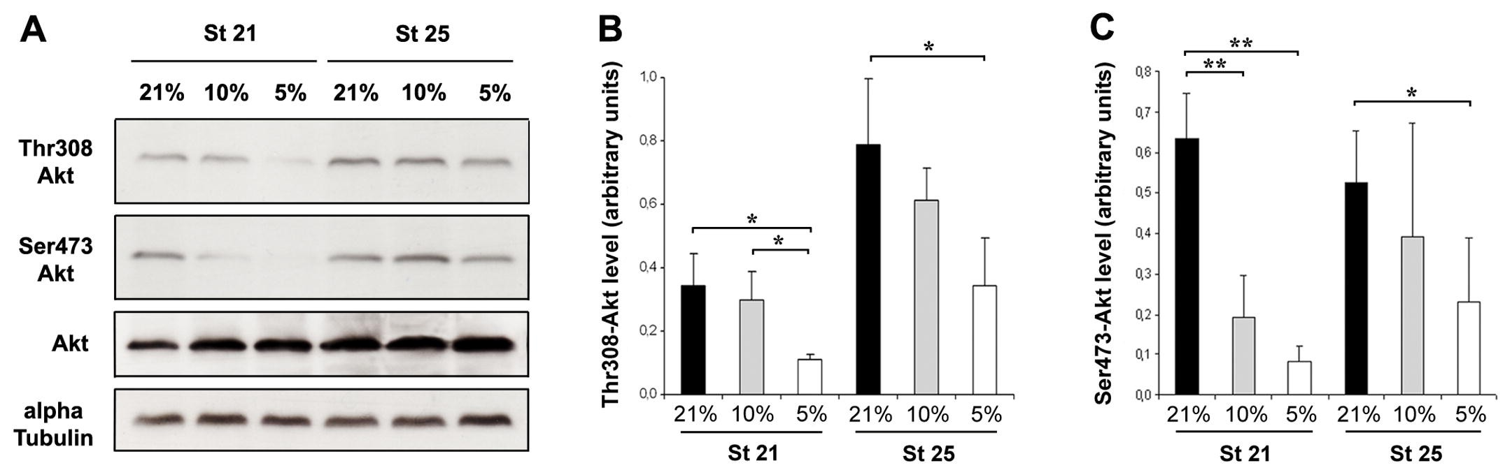 Fig. 2. Hypoxia decreases Akt phosphorylation. (A) Western blot analysis. Protein extracts at stages 21 and 25 from embryos exposed to 21%,