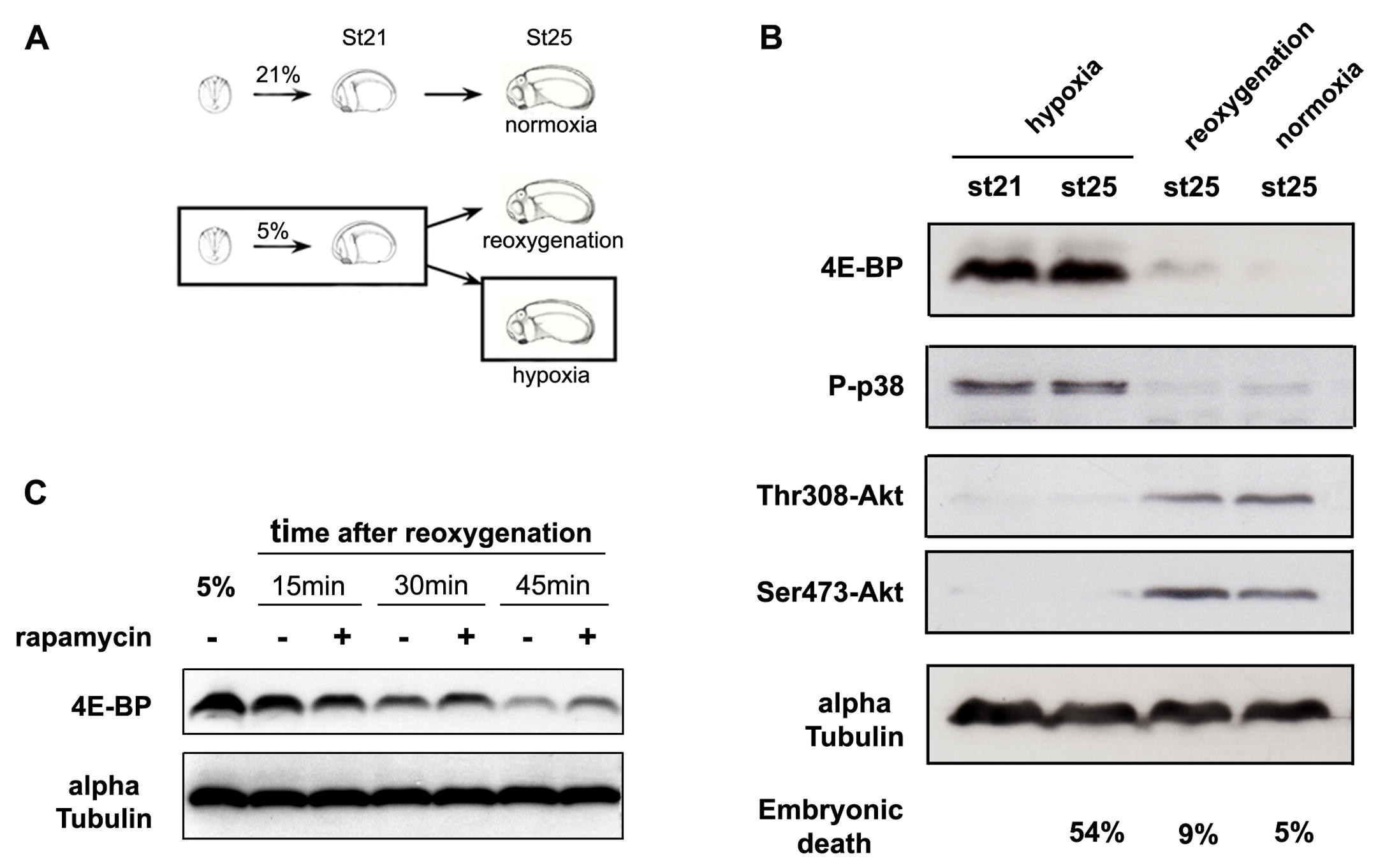 (A) Western blot analysis. Protein extracts from embryos exposed to 21%, 10% and 5% O2, at stages 21 and 25 were resolved by electrophoresis, blotted and reacted with anti-4E-BP antibodies (9452, Cell Signaling). Anti-α tubulin antibodies were used as a loading control.