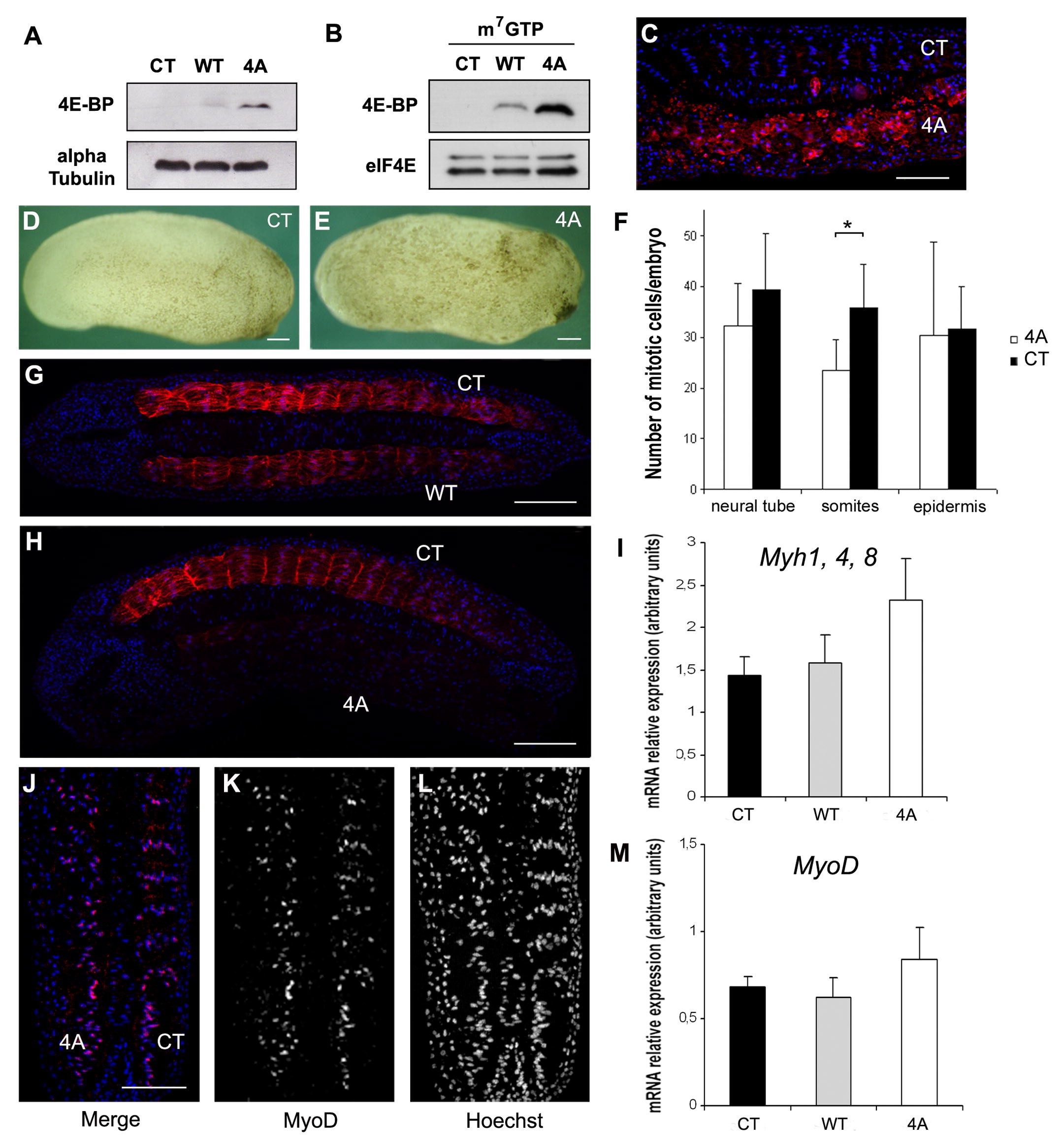 was much lower. (B) Isolation of eIF4E and its partners from stage 25 embryo extracts was performed using m7GTP Sepharose beads before Western blot analysis. Immunoblots with anti-4E-BP (alpha 69) and anti-eIF4E antibodies were performed. WT-4E-BP and 4A-4E-BP proteins bind eIF4E. (C) Embryos were unilaterally injected at the four-cell stage into the presumptive somite region with the WT-4E-BP or 4A-4E-BP constructs. At stage 25, embryos