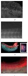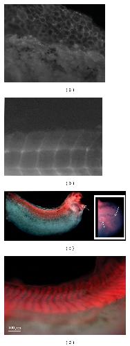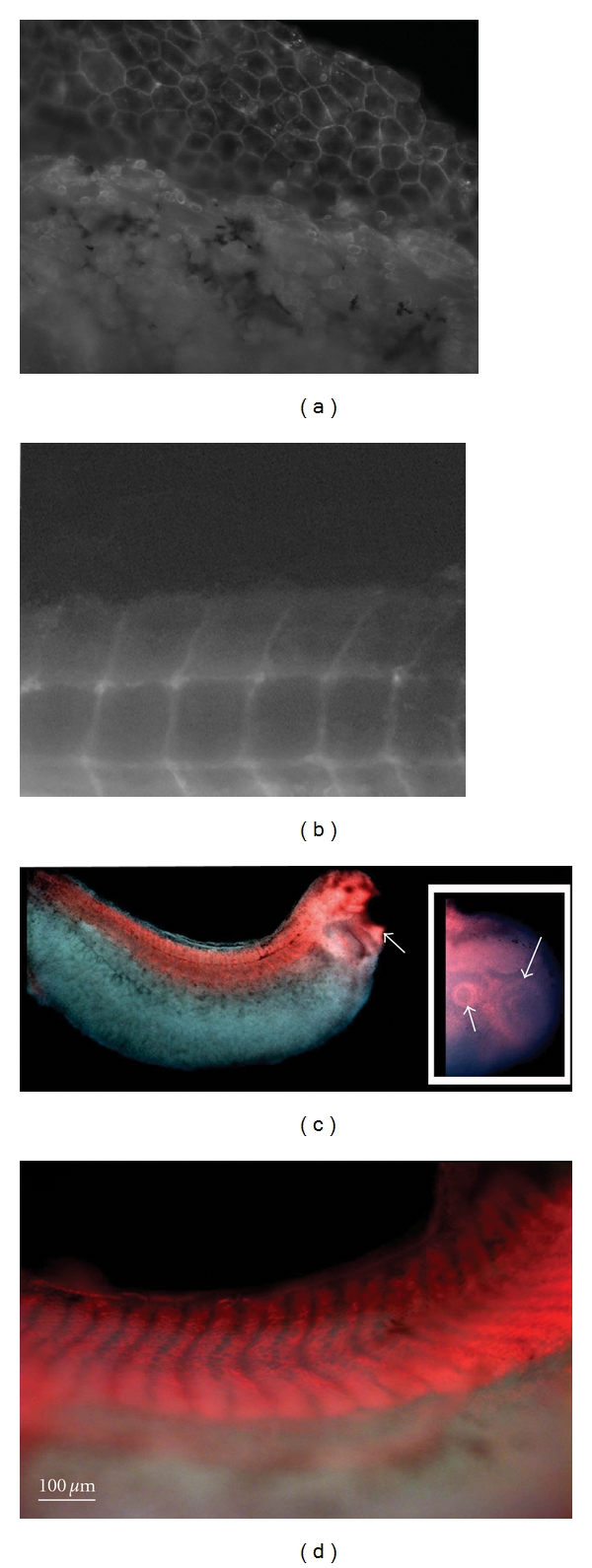 Figure 1. Proteinase K treatment is necessary to allow QD penetration and labeling of deep tissues in Xenopus and QD705ânm anti-Dig conjugates can be used for the detection of transcripts in wholemount in situ hybridization experiments. (a) Detection of biotinylated 4G10 (anti-Phosphotyrosine) antibody using streptavidin conjugated 655ânm QDs in a triton permeabilized embryo. Specific staining can be seen at the cell-cell boundaries of the ectodermal cells of the fin (upper part of the image) but not in the deep tissues (somites at the bottom part of the image). (b) Detection of biotinylated 4G10 (anti-Phosphotyrosine) antibody using streptavidin conjugated 655ânm QDs in a PK permeabilized embryo. Specific staining of the deep intersomitic boundaries can be seen. Superficial cells of the fin cannot be seen due to degradation of this delicate structure by the PK treatment. (c) QD705ânm anti-DIG antibody labeling of the probe for LTBP1 generates a staining pattern that closely matches the published expression for this mRNA [1]. QDs label the somites as well as anterior neural and neural crest tissues including the branchial arches and a region surrounding the eye. (d) Imaging of the QD labeling for LTBP1 in the somites at 10X magnification.