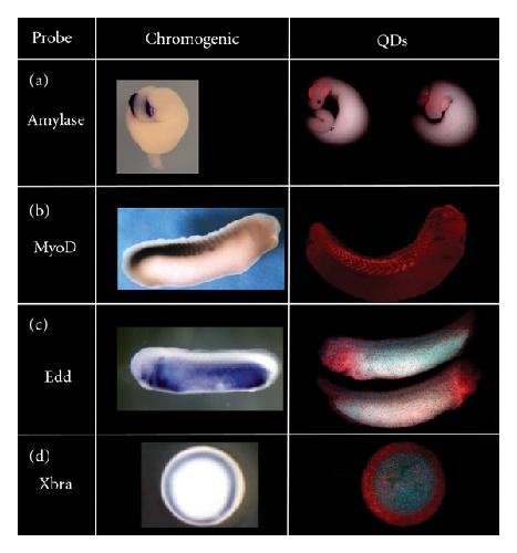 In situ hybridization using QDs compares favorably with chromogenic in situ hybridization staining for a number of well-characterized mRNAs. (a) 705ânmQD-streptavidin staining for amylase on dissected Xenopus guts, using a biotinylated amylase probe, is compared to the staining obtained by chromogenic reaction (left). The staining using QDs is identical to that using a chromogenic reaction and restricted to the pancreas, where amylase mRNA is expressed. It is worth noting that the pancreas, a morphologically identifiable organ, is extremely autofluorescent making detection of fluorescent staining difficult. (b) Comparison of the QD and chromogenic staining for MyoD a muscle marker (using a FITC-labeled probe). The 655ânmQD anti-FITC and the chromogenic staining are similar, but the QD staining gives much better resolution of the posteriorsomites. (c) Comparison of QD versus chromogenic staining for the Edd transcript, an endodermal marker expressed through the tadpoles gut at varying levels (using a Biotin-labeled probe). The staining using a chromogenic protocol is significantly stronger in this case and the 705ânmQD-Streptavidin seems restricted to the high expression regions. Careful observation reveals that the staining is present throughout the gut region but is masked by the intense autofluorescence of the gut. (d) Comparison of the QD staining versus the chromogenic staining for Xbra, a widely used mesodermal marker (using a Biotin-labeled probe). The marker is known to label the mesodermal belt at gastrula stages; both the chromogenic, as well as the QD-streptavidin protocols result in the same staining pattern consistent with the mesodermal belt.