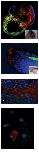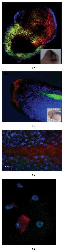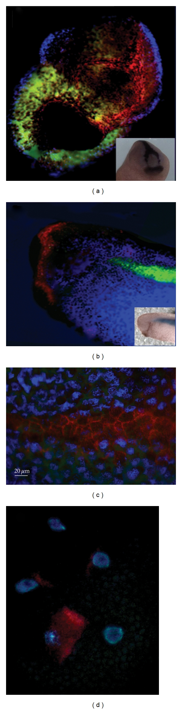 Figure 4. Double whole-mount in situ hybridization against cardiac actin and Xa-1 and the intracellular distribution of LTBP1 and Xa1. (a) A comparison of the staining pattern between the chromogenic and QD-based visualization of the FITC-labeled Xa-1 probe, shown in red, reveals that the QD staining is identical to that obtained using the standard chromogenic protocol. (b) An embryo processed using Biotin and FITC-labeled probes against cardiac actin (green) and Xa-1 (red), respectively. The two probes were visualized with spectrally resolvable QDs demonstrating that two color fluorescent in situs can be performed using QDs. The inset shows the chromogenic staining for cardiac actin for comparison. (c, d) Images of embryos processed for whole-mount in situ hybridization and counterstained with Hoechst (blue) at 20X (c) and 40X (d) magnification, showing differences in the intracellular distribution of the transcripts of Xa-1 (c) and LTBP1 (d), both shown in red.