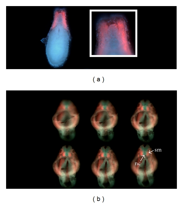 Figure 2. QD-streptavidin staining of LTBP1 compares favorably with the published staining achieved using standard chromogenic protocols in the deeper structures of the embryo [1]. (a) A transverse section from a whole mount in situ indicating the LTBP1 transcript expression pattern using QD705ânm streptavidin. The somitic staining obtained using QDs is identical to the published data using the chromogenic protocol [1], showing that the QD-streptavidin solution can penetrate and stain the deep areas of the somites. (b) A series of transverse optical sections of a QD-streptavidin-stained embryo for the LTBP1 message. The optical sections reveal that the staining previously identified as notochord by the chromogenic protocol is in fact somitic mesoderm flanking the notochord (nc: notochord, sm: somatic mesoderm).