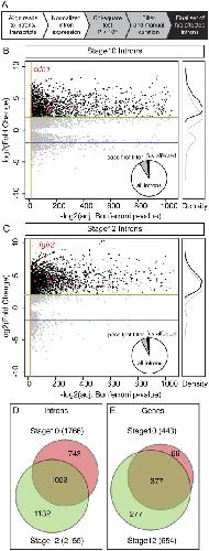 Figure 6. Intron retention in fus morphants affects a small fraction of all introns and transcripts. (A) Brief outline of the strategy for identifying affected introns. Scatter plot showing stage 10 (B) and stage 12 (C) introns with an adjusted P-value of <10â5. The distribution of the first pass introns (gray) indicates that the P-value is not sufficient to identify retained introns in fus morphants, as a significant number of the passed introns display only small changes. Introns changed more than fourfold and those that passed validation are shown in black. As a reference, introns from cdh1 at stage 10 (B) and from fgfr2 at stage 12 (C) are plotted as red dots. Pie charts in the bottom right of the scatter plots show the proportion of introns that pass the first filter (gray slice) and the final validated set of fus-affected introns (black slice). The white slice represents unchanged introns from expressed genes. Unchanged introns (P > 10â5) are not plotted in the scatter plots. Orange lines indicate the cutoff P-value = 10â5, and green and blue lines indicate thresholds for fourfold increase and decrease, respectively. The right panel shows relative kernel density plots of first-pass introns (gray line) and the final curated set (black line). (D) Area-proportional Venn diagrams showing the number of retained introns in fus morphants at stages 10 (red) and 12 (green), showing significant overlap between the stages. The number in parentheses indicates the total number of introns retained at the given stage. (E) Venn diagram similar to D, but showing the number of genes with retained introns in fus morphants. A significant majority (85%) of genes that are affected at stage 10 are also affected later, whereas almost half (42%) are only affected at stage 12.