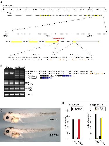 Figure 5. Pervasive intron retention in fus morphants detected by RNA-seq. In all panels, the top yellow and gray track shows the JGI v7.1 gene models for reference. The black tracks show the control read profile, and the red tracks show read profile for fus morphants. (A) Two splice forms, fgfr2b and fgfr2c, are detected in control lanes at stage 10, whereas only fgfr2b is detected in fus morphants. The alternatively spliced region is boxed in blue. At stage 12, the control read distribution is similar to that at stage 10, whereas the fusMO lane shows a complete flattening of the transcript profile, indicating that all introns are retained. (B) Normal exon profile of cdh1 in control lane at stage 10; dramatic intron retention is apparent in fus morphants. (C) The bcad transcript is normal in fus morphants at stage 10.