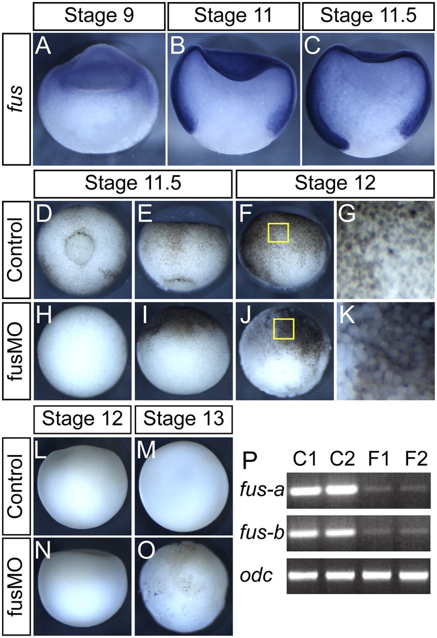 Figure 1. fus is expressed in the animal region, and knockdown results in gastrulation defects and animal dissociation. All pictures show a lateral view with the animal region up, except for D and H, which show vegetal view. (AâC) Normal embryos bisected and subjected to ISH with fus antisense probe. (A) Initial fus staining at stage 9 is confined to the animal region. (B) At mid-gastrulation, fus is expressed strongly throughout the prospective mesodermal and ectodermal regions but is excluded from the endoderm. (C) This pattern persists through gastrulation, although some weak staining can be observed in vegetal cells. (DâK) fus knockdown results in lack of blastopore formation and cell dissociation. (D,E) Normal embryos at mid-gastrulation, with prospective mesendoderm involuting at the blastopore. (H,I) fus morphants show complete lack of blastopore formation and gastrulation movements. (F) Normal embryo showing intact epithelia. (J) Individual cells detach from the animal and marginal regions in fus morphants. (G,K) Magnified view of the yellow box in F and J, respectively. (LâO) Absence of apoptosis during gastrulation in fus morphants. Control (L,M) and fusMO (N,O) embryos TUNEL-stained for apoptotic cells at cell dissociation (L,N) or after cell dissociation occurs (M,O). No apoptotic cells were detected at stage 12, when cell dissociation happens. At stage 13, some apoptotic cells that were detected in fus have dissociated and therefore mostly likely show a secondary effect. (P) Single-embryo RTâPCR spanning the first four exons of fus on embryos injected with fusMO4 showing aberrant splicing of the first intron in fus transcripts. Normal transcripts of both homeologs (fus-a and fus-b) in X. laevis are significantly reduced relative to control odc transcripts.