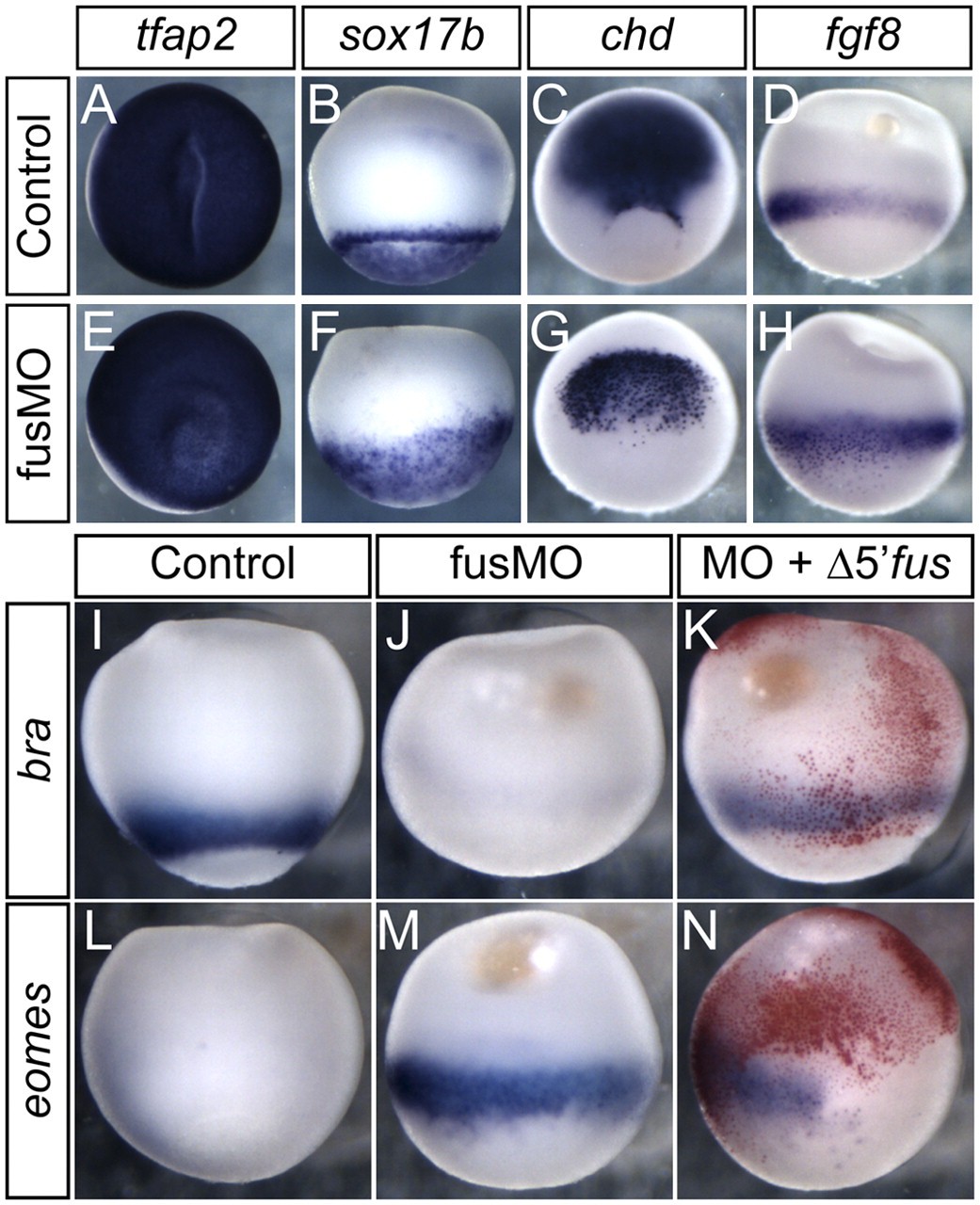 Figure 2. fus morphants form all germ layers, but have mesodermal differentiation defects. All pictures show lateral view with animal region up, except for A and E, which show an animal view, and C and G, which show a dorso-vegetal view. (AâH) Normal zygotic and localized gene expression in fus morphants. (A,E) Zygotic ectodermal tfap2 expression is normal in fus morphants. (B,F) Zygotic endodermal sox17b expression is normal in fus morphants. (C,G) Normal dorsal mesoderm expression of chd in fus morphants. Notice the superficial staining in fus morphants caused by lack of invagination of the mesoderm. (D,H) Normal marginal zone fgf8 expression in fus morphants. (IâN) Mesodermal differentiation defects in fus morphants. (I,J) bra is expressed circumferentially in the marginal zone in normal embryos but is essentially absent in fus morphants. (L,M) eomes expression is restricted to a narrow region of the dorsal mesoderm in normal embryos but is significantly elevated in fus morphants. (K) Rescue of bra expression in fus morphants by injection of MO-resistant fus mRNA. (N) Partial rescue of blastopore formation and eomes repression upon fus mRNA injection.