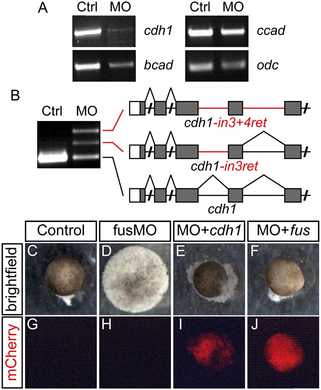 Figure 4. Missplicing of cdh1 underlies the cell adherence defect in fus morphants. (A) RTâPCR of full-length cadherin transcripts showing significant and specific reduction of cdh1 in fus morphants, whereas bcad and ccad levels are normal. odc was used as RTâPCR control. (B) Intron retention of cdh1 in fus morphants causes a decrease in properly spliced transcripts. RTâPCR using primers covering the first five exons of cdh1 detects two aberrant transcripts retaining intron 3 (cdh1-in3ret) or introns 3 and 4 (cdh1-in3+4ret), respectively. (CâJ) Restoration of cell adherence by cdh1 and fus mRNA in fusMO-injected animal caps. (C) Control animal cap forms an epidermal ball (24 of 24 caps had epithelial integrity). (D) The fusMO-injected animal cap completely dissociates into individual cells (zero of 22 showed integrity). (E) Epithelial integrity in animal cap coinjected with fusMO and cdh1 mRNA (14 of 19). (F) Epithelial integrity in animal cap coinjected with fusMO and MO-resistant fus mRNA (13 of 16). (GâJ) Red fluorescence emission from coinjected mCherry mRNA used as tracer in E and F.