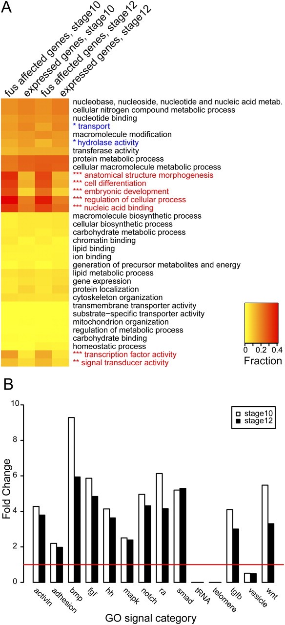 Figure 7. GO term analysis of fus-affected genes. (A) Intron-retained genes in fus morphants are enriched for developmental regulators. Heat map showing GO slim terms annotated to intron-retained genes in fus morphants and expressed genes at stage 10 and stage 12. GO slim categories that are significantly enriched in fus-affected genes are indicated in red, and categories that are depleted are in blue. GO slim categories that contain terms associated with embryo development, morphogenesis, and differentiation (anatomical structure morphogenesis, cell differentiation, and embryonic development) are enriched in fus-affected genes. Also enriched are terms associated with transcription (nucleic acid binding and transcription factor activity) and signal transduction (signal transducer activity). (Inset) Values are expressed as a fraction of genes that are assigned the GO slim term, with rarely represented terms in yellow and more common terms in red. (***) P < 0.001; (**) P < 0.01 at both stage 10 and stage 12. (*) P < 0.05 at stage 12 only. Only GO slim terms from levels 3 and 4 in the categories âmolecular functionâ and âbiological process,â respectively, are shown. (B) All major developmental signaling pathways are affected in fus morphants. Bar graph showing the representation of GO signal categories in fus-affected genes expressed as fold change compared with expressed genes. The major developmental pathways regulated by either activin, adhesion, bone morphogenetic protein (bmp), fgf, hedgehog (hh), MAP kinase (mapk), notch, retinoic acid (ra), smad, tgf-β (tgfb), and wnts are enriched at stages 10 and 12. In contrast, GO terms associated with transfer RNA (tRNA), telomere, and intracellular vesicles (vesicle) are depleted in fus-affected genes. The red line indicates no change.