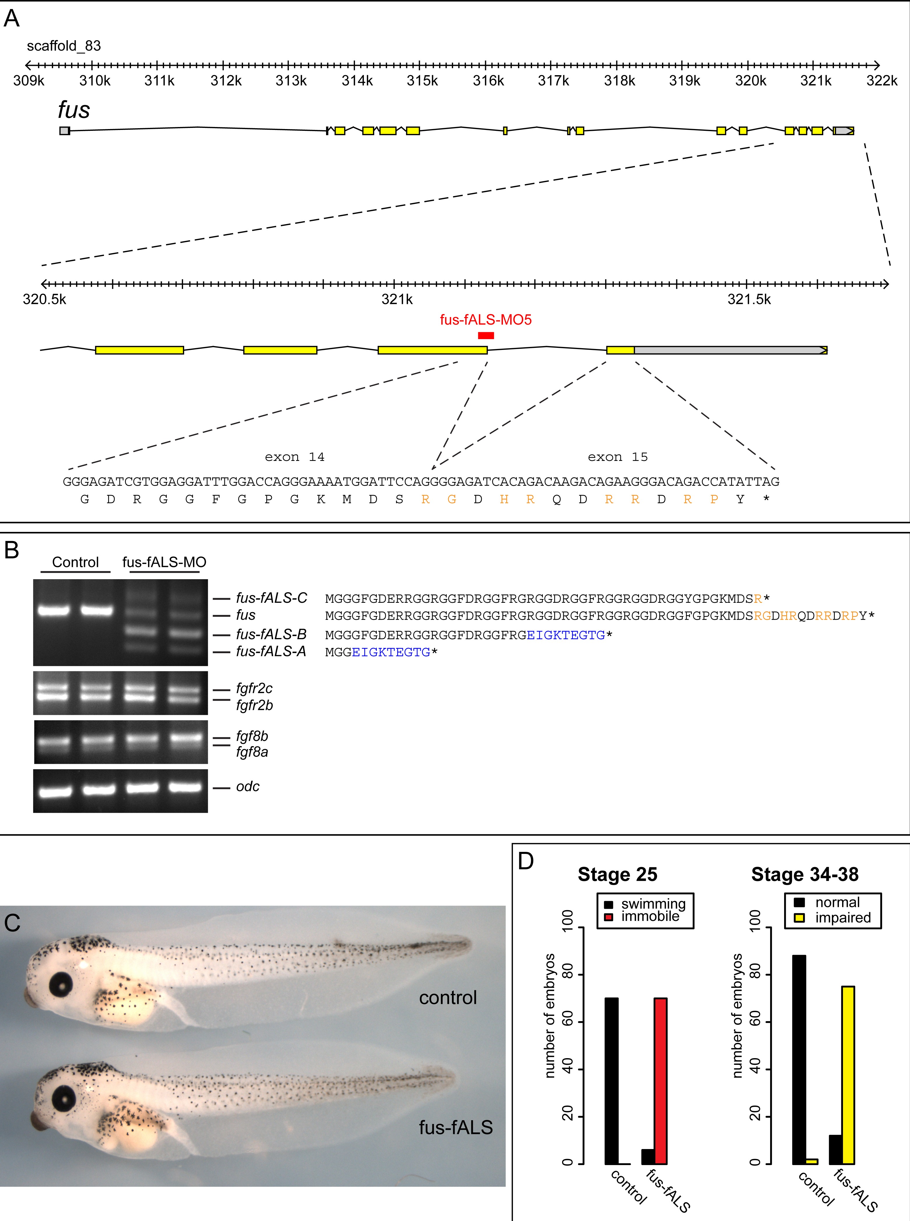 Supplemental Figure 1. The C-terminal tail of fus is dispensable for splicing. (A) fus genomic locus showing the full gene model in the top panel, and a close up of the last four exons in the bottom. The C-terminal region contains eight conserved amino acid residues (orange) that have been linked to fALS in humans and seven of these are encoded in the last exon 15. The splice blocking MO fus-fALS-MO5 (red) targets the donor splice site in exon 14. (B) Single embryo RT-PCR on two control embryos or fus-fALS morphants at stage 25. (B, Top panel) Missplicing of the last splice junction of fus resulting either in intron inclusion (fus-fALS-C), causing premature stop or use of two cryptic splice donor sites in exon 14 (fus-fALS-B and fus-fALS-A) that cause a frame shift. In all cases the result is C-terminal truncated forms of fus without the C-terminal region containing the residues mutated in fALS mutations. (B, lower panels) normal splicing and expression of fgfr2 and fgf8 in fus-fALS morphants. Internal control was odc. (C) fus-fALS morphants develop normally at least until stage 41. (D) fus-fALS morphants are immobile after hatching (stage 25, left barplot). As development proceeds fus-fALS morphants gain mobility, but are still impaired compared to normal embryos (stage34-38, right barplot). Normal swimming was scored as ability to swim for at least one second after being prodded. Swimming for shorter duration was scored as impaired.