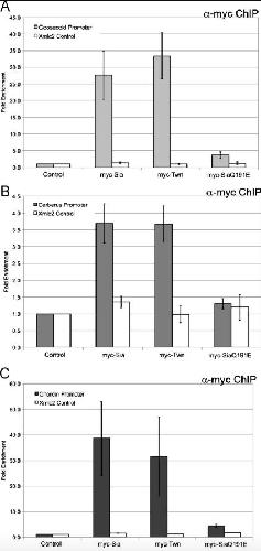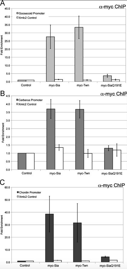 Fig. 3. Wnt pathway effectors occupy organizer gene promoters. Genomic regions recovered by chromatin immunoprecipitation (ChIP) from embryos injected with 50 pg myc-Sia, 50 pg myc-Twn or 50 pg of a DNA-binding inactive Sia (myc-SiaQ191E) were evaluated by quantitative PCR (QPCR) for the (A) Gsc, (B) Cer, or (C) Chd promoters. Immunoprecipitation using anti-myc antibody was performed on uninjected embryos (Control). The mean fold enrichment (normalized to uninjected samples) and standard error for five independent experiments is presented. The white bars represent QPCR for genomic Xmlc2 as a control.