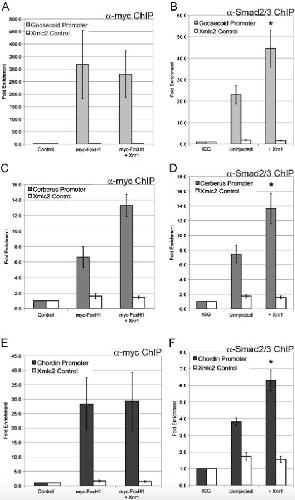 Fig. 4. Nodal pathway effectors occupy organizer gene promoters. (A), (C), (E) Genomic regions recovered by ChIP for myc-FoxH1, or myc-FoxH1 coexpressed with Xnr1 (myc FoxH1+Xnr1) were evaluated by QPCR for the (A) Gsc, (C) Cer, or (E) Chd promoters. Immunoprecipitation using anti-myc antibody was performed on uninjected embryos (Control). The data presented represent three independent experiments. (B), (D), (F) Genomic regions recovered by ChIP for endogenous Smad2/3 in uninjected embryos or embryos expressing Xnr1 mRNA (+Xnr1) were evaluated by QPCR for the (B) Gsc, (D) Cer, or (F) Chd promoters. Rabbit IGG added to uninjected embryo extract serves as a negative control (IGG). The mean fold enrichment (normalized to uninjected samples) and standard error for three independent experiments is presented. The white bars represent QPCR for genomic Xmlc2 as a control. * Indicates p value <0.05 as compared to uninjected embryos.
