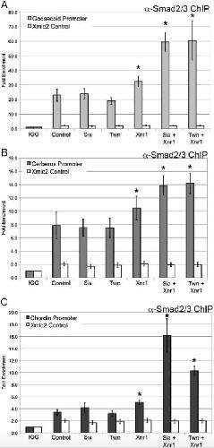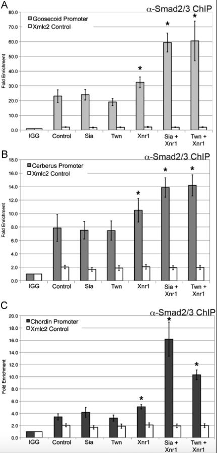 Fig. 6. Smad2/3 occupancy at organizer promoters is enhanced by Siamois/Twn and Nodal. Genomic regions recovered from ChIP for endogenous Smad2/3 in uninjected embryos (Control), or embryos expressing 50 pg Sia, 50 pg Twn or 50 pg Xnr1, or combinations of 50 pg Sia and 50 pg Xnr1 or 50 pg Twn and 50 pg Xnr1 were evaluated by QPCR for the (A) Gsc, (B) Cer, or (C) Chd promoters. The white bars represent QPCR for genomic Xmlc2 as a control. Smad2/3 association with the promoters is significantly enhanced (*p value <0.05) in the presence of Xnr1 as compared to uninjected embryos. Smad2/3 association with the promoters is further enhanced (*p value <0.05) in the presence of Sia and Xnr1 or Twn and Xnr1 as compared to Sia, Twn, or Xnr1 alone. The mean fold enrichment (normalized to uninjected samples) and standard error for six independent experiments is presented.