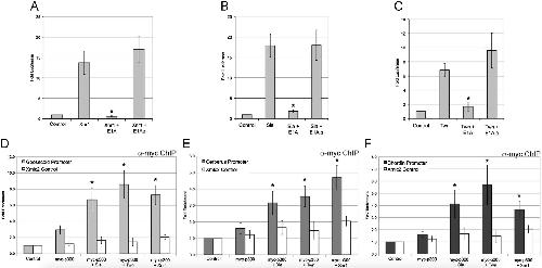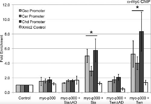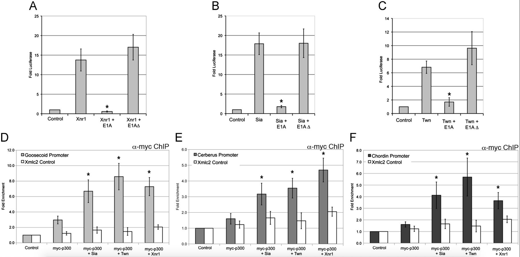 Fig. 7. Recruitment of p300 to organizer gene promoters by Wnt and Nodal pathway effectors. (A)â(C) At the one-cell stage the animal pole was injected with Xnr1 (A), Sia (B) or Twn (C), either alone or together with full length E1A or E1AÎ2-36 as a negative control. Two-cell embryos were injected with the Gsc reporter (100 pg) and CMV-Renilla Luciferase (10 pg) plasmids. Animal explants prepared at the blastula stage were assayed for luciferase activity at the midgastrula stage. Values shown are normalized to Renilla luciferase activity, and represent fold activation of reporter activity in the absence of injected mRNAs. The mean and standard error for three independent experiments are presented. âIndicates p value <0.05 as compared to Xnr1, Sia or Twn activation of Gsc reporter. (D)â(F) Genomic regions recovered by ChIP for myc-p300 (4 ng plasmid injected) either alone or coexpressed with 150 pg GST-Sia or 150 pg GST-Twn or 50 pg Xnr1 were evaluated by QPCR for the (D) Gsc, (E) Cer, or (F) Chd promoters. The white bars represent QPCR for genomic Xmlc2 as a control. The mean fold enrichment (normalized to uninjected samples) and standard error for six independent experiments is presented.âIndicates p<0.05 when compared to myc-p300 alone.