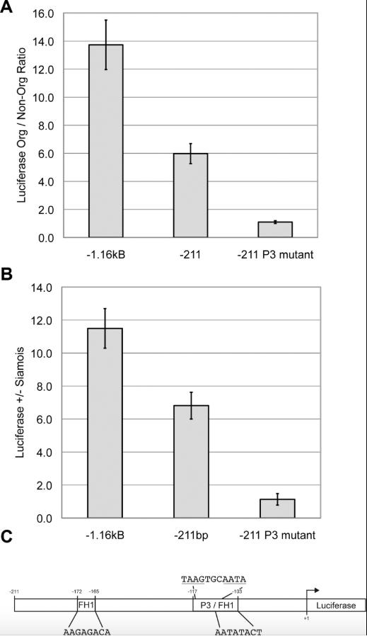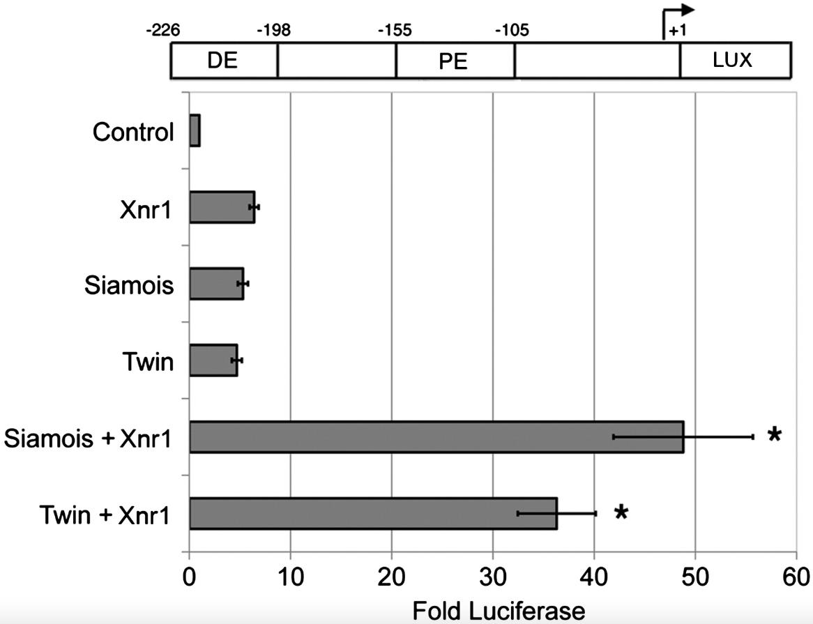 Fig. 1. Nodal and Wnt effectors synergistically activate the Gsc promoter. One-cell stage embryos were injected with 50 pg of Sia, Twn or Xnr1 mRNAs, or a mixture of Sia (50 pg) and Xnr1 (50 pg) or Twn (50 pg) and Xnr1 (50 pg). At the two-cell stage plasmid encoding Gsc reporter (100 pg; diagramed at top) was injected with CMV-Renilla Luciferase (10 pg). Animal explants prepared at the blastula stage were assayed for luciferase activity at the midgastrula stage. Values shown are normalized to Renilla luciferase activity, and represent fold activation of reporter activity in the absence of injected mRNAs. The mean and standard error for three independent experiments are presented. * Indicates p value<0.05.
