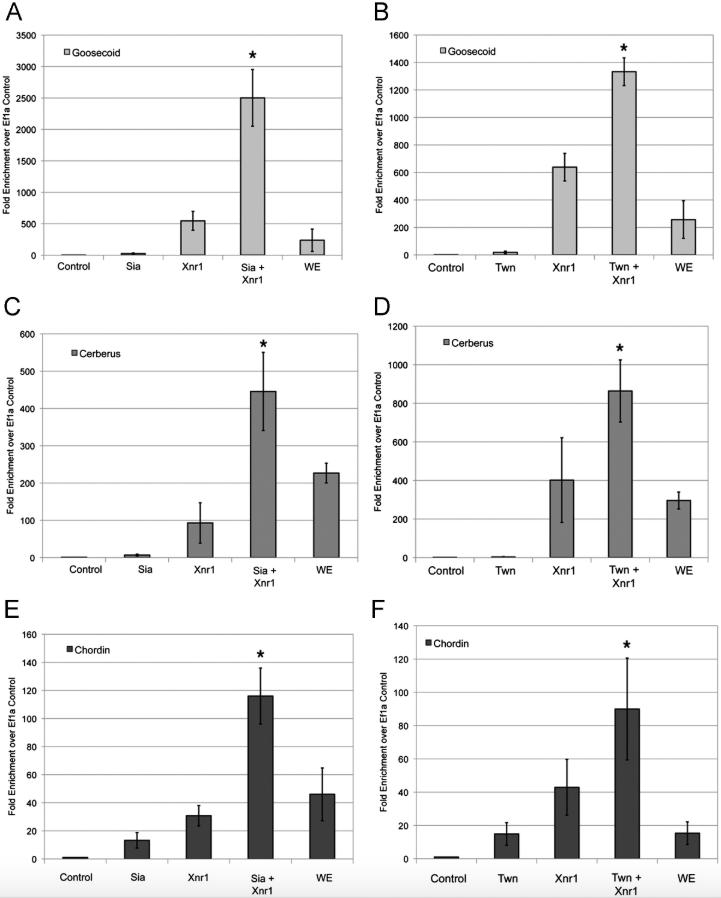 Fig. 2. Nodal and Wnt effectors synergistically activate organizer gene transcription. Analysis of Gsc (A), (B), Cer (C), (D) or Chd (E), (F) transcript expression in animal cap explants in response to injection of (A) ,(C), (E) 50 pg Sia, 50 pg Xnr1, or 50 pg Sia and 50 pg Xnr1 or (B), (D), (F) 50 pg Twn, 50 pg Xnr1, or 50 pg Twn and 50 pg Xnr1. Animal explants were analyzed by quantitative RT-PCR at the gastrula stage for the expression of Gsc, Chd or Cer normalized to Ef1α. Control represents uninjected animal explants and WE represents intact embryos. * Indicates p<0.05 as compared to the Sia, Twn and Xnr1 conditions. The mean and standard error for six independent experiments is presented. Identical reactions without reverse transcriptase served as negative control (data not shown).