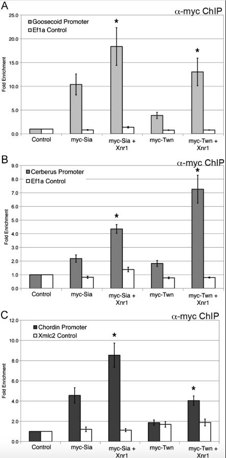 Fig. 5. Siamois/Twin occupancy at organizer promoters is enhanced by Nodal signaling. Genomic regions recovered by ChIP for 10 pg myc-Sia, 10 pg myc-Sia and 50 pg Xnr1, 10 pg myc-Twn, or 10 pg myc-Twn and 50 pg Xnr1 were evaluated by QPCR for the (A) Gsc, (B) Cer or (C) Chd promoters. The white bars represent QPCR for genomic EF1α as a control. The mean fold enrichment (normalized to uninjected samples) and standard error for eight independent experiments is presented.