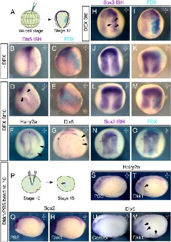 Fig. 5. The neural plate (NP) and neural plate border (NPB) respond to Wnt signals in successive time windows. AâM. Embryos were injected at the 64-cell stage with the inducible beta-catenin contruct β-cateninGR and fixed at stage 12 to determine the specific affect on either NP or NPB markers. BâC. No affect on Dlx5 is seen in the absence of dexamethasone (0% of embryos, n = 9). DâE. Dlx5 is inhibited within injected cells when the construct is activated at stage 10 (70% with inhibition, n = 10). HâI. Inhibition of Sox2 is observed within injected cells when the construct is activated immediately after injection (75% of embryos with inhibition, n = 16). JâK. Little affect is observed upon Sox3 activation at stage 10 (14% of embryos with slight inhibition, n = 14). LâM. No affect is observed in the absence of dexamethasone 0% of embryos affected, n = 22). FâO. Injection of β-cateninGR at the 32-cell stages leads to a loss of both Hairy2a (F; 50% of embryos affected, n = 8) and Dlx5 (G; 65%, n = 23) at stage 15. No affect was observed in the absence of dexamethasone (data not shown, 0%, n = 24). No inhibition of Sox2 was observed either in the presence (G; 0%, n = 38) or absence (data not shown, 0% n = 36) or dexamethasone. PâV. Dkk1/PBS or PBS soaked beads were grafted next to the prospective neural crest at stage 10 and embryos were fixed at stage 15. No expansion of the neural plate was detected either with PBS beads (Q; 0%, n = 24) or with Dkk1 (R; 0%, n = 12). No effect was observed with BSA soaked beads on Hairy2a (S; 0%, n = 26), an expansion was observed with Dkk1 (T; 63%, n = 36). An expansion of Dlx5 was also observed with Dkk1 beads (V; 75% of cases, n = 8) compared to control side (U). Black arrows indicate areas affected, black circles indicate position of grafted bead |