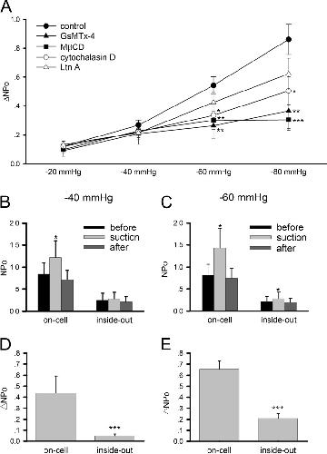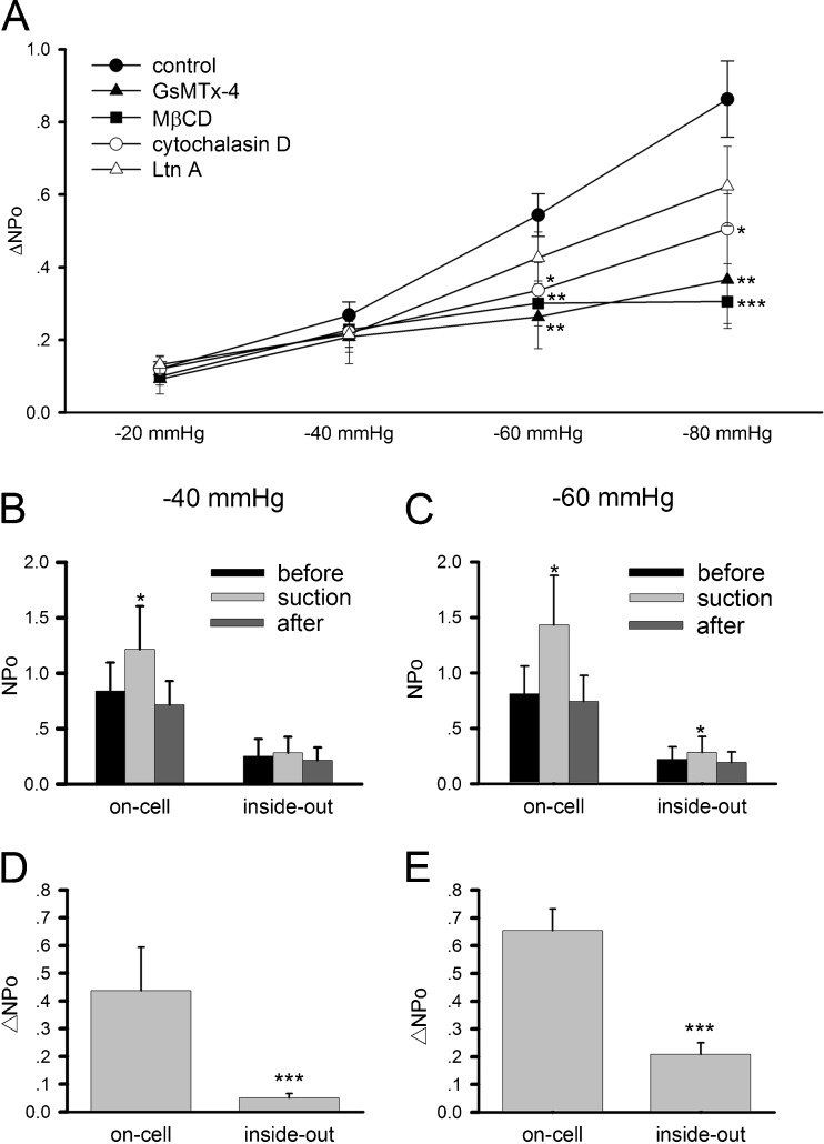 Fig. 3. Analyses of AChR mechanosensitivity in HEK293T cells. a Effects of different pharmacological agents on ΔNPo. Cell-attached single-channel recording was conducted. GsMTx-4 (1 μM), a mechanosensitive channel blocker, was included in the recording pipette. Cells were incubated before recordings for 20 min in 10 mM MβCD, a cholesterol-depleting agent; 30 min in 2 μM cytochalasin D, an F-actin inhibitor; or for 2 h in 5 μM latrunculin A, another F-actin inhibitor. Number of patches recorded: 26 (control), 26 (GsMTx-4), 19 (MβCD), 29 (cytochalasin D), and 19 (latrunculin A). b–e Comparison of on-cell and inside-out recordings. Data are mean ± SEM based on n = 10 patches (for each negative pressure). The same membrane patch was first recorded on-cell and then detached from the cell for inside-out measurement with a pipette holding potential of +70 mV and 0.5 μM ACh. *p < 0.05; **p < 0.01; ***p < 0.001