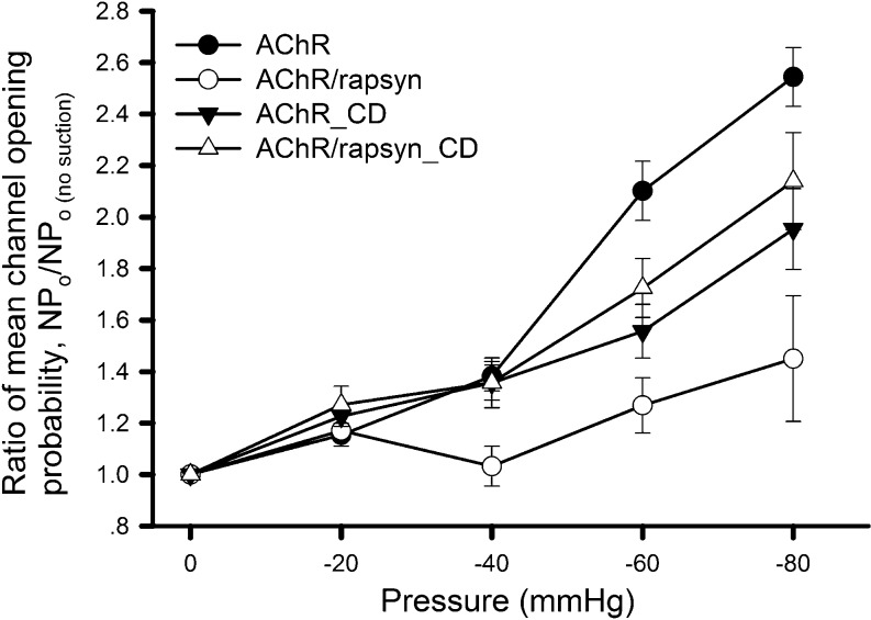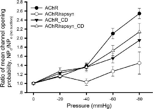 Fig. 6. Ratio of NPo under different experimental conditions. HEK293T cells expressing AChRs alone or together with rapsyn were recorded in the presence or absence of cytochalasin D (CD; 2 μM, 30 min pre-incubation). The NPo values obtained at each negative pressure were divided by the respective basal NPo. Data from more than 20 patches were pooled for each point. Studentâsât test showed no significant difference between the results of AChR_CD and AChR/rapsyn_CD (pâ>â0.2)