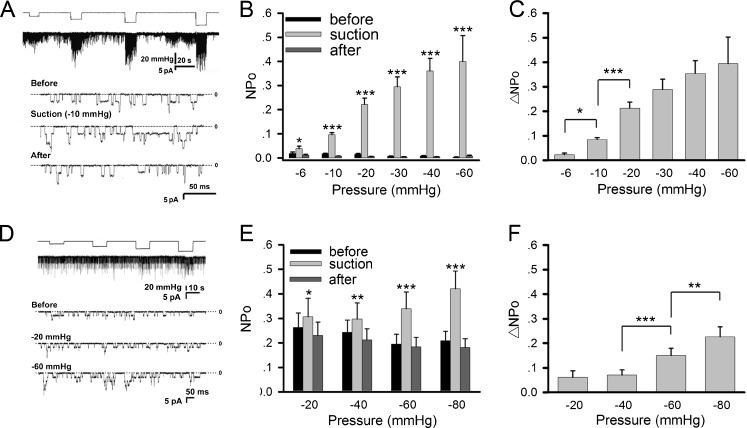 Fig. 1. Mechanosensitivity of AChRs in muscle cells. AChR activity was studied in cultured Xenopus myotomal muscle cells (a–c) and C2C12 myotubes (d–f). a Sample traces of ACh-induced single-channel currents from Xenopus muscle cells recorded with the patch-clamp method under negative pipette pressure of different magnitudes. Pipette ACh concentration = 0.2 μM, holding potential = +70 mV, cell-attached mode. b Channel activity NPo and c its difference ΔNPo under different negative pressures. For the NPo plot, values before (black), during (gray), and after (dark gray) negative pressure application are shown. Data are mean ± SEM, number of patches n = 9, 91, 46, 46, 44, 18 for negative pressures of −6, −10, −20, −30, −40, −60 mmHg, respectively. d AChR single channel currents recorded from C2C12 myotubes under different negative pressures. ACh concentration = 0.5 μM. e NPo values before (black), during (gray), and after (dark gray) negative pressure application. f ΔNPo data from C2C12 cells. Data from 20 patches at each negative pressure were pooled. Statistics: *p < 0.05; **p < 0.01; ***p < 0.001 (Student’s paired t test). For NPo plots, comparisons were made between values obtained during and before negative pressure application