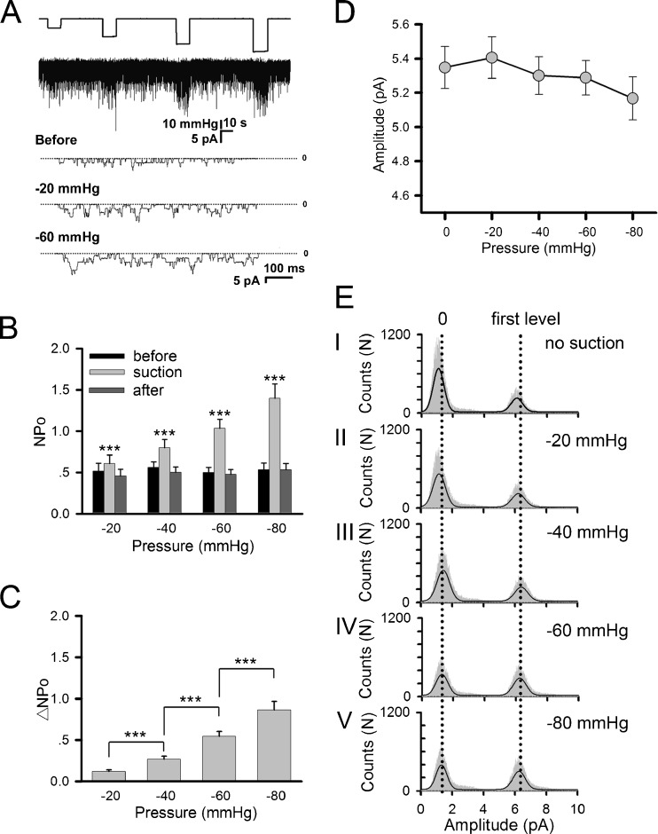 Fig. 2. Mechanosensitivity of AChRs exogenously expressed in HEK293T cells. Cells were transfected with AChR subunits α, β, δ, and γ. a Sample traces of ACh-induced currents under different negative pressures. Included in the pipette was 0.5 μM ACh. b Channel activity NPo and c its difference ΔNPo under different negative pressure levels; the former shows values before (black), during (gray), and after (dark gray) negative pressure application; n = 26, 24, 22, 10 patches for −20, −40, −60, −80 mmHg, respectively. Symbols denoting statistical significance are the same as in Fig. 1. d Mean amplitudes of single channel currents at different negative pressures. These values were calculated from all-points amplitude histograms as shown in (e), taking the difference between the first and second peak as the mean single-channel AChR current amplitude