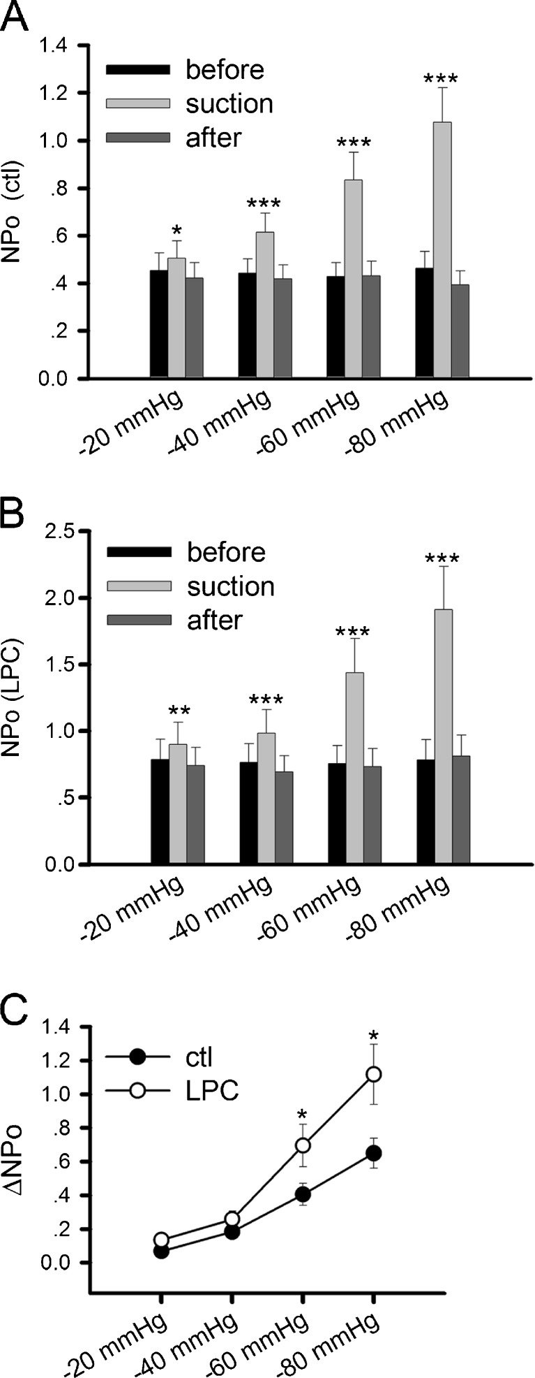 Fig. 4. Effect of LPC on AChR mechanosensitivity. AChR-expressing HEK293 cells were pretreated with LPC for 10 min before patch-clamp recording. a Channel activity NPo of AChRs before (black), during (gray), and after (dark gray) negative pressure application in control cultures; n = 16 patches. b NPo of LPC-treated AChRs; n = 16 patches. c The difference of NPo for control and LPC-treated AChRs at different negative pressure