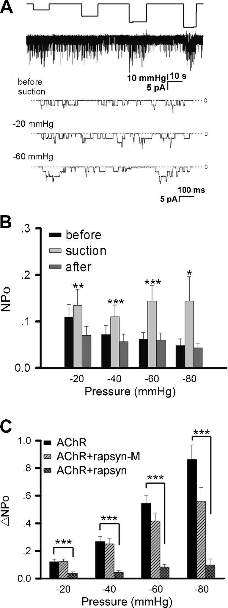 Fig. 5. The effect of rapsyn on AChR mechanosensitivity. HEK293T cells were transfected with cDNAs encoding AChR subunits plus one encoding rapsyn. a Sample current recording of AChRs under different pipette negative pressures in the cell-attached mode; pipette holding potential +70 mV with 0.5 μM ACh. b NPo of ACh-induced single-channel currents from rapsyn-co-expressing cells before (black), during (gray), and after (dark gray) negative pressure application. Note the reduced scale of y-axis compared to Figs. 1 and 2. Nâ=â21, 18, 11, 6 patches for â20, â40, â60, â80 mmHg, respectively. c ÎNPo values of AChRs expressed alone, with rapsyn or with mutant rapsyn lacking the AChR-binding domain (rapsyn-M). Data from 18 to 26 patches were pooled. *pâ<â0.05; **pâ<â0.01; ***pâ<â0.001