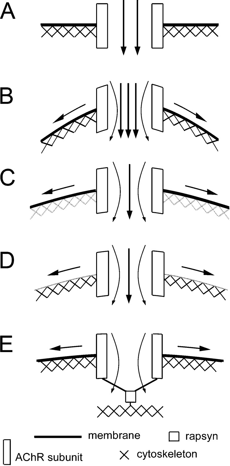 Fig. 7. A model on the regulation of AChR mechanosensitivity by the membrane and the cytoskeleton. a Channel opening under zero negative pressure. As a transmembrane molecule, AChRâs gating property can potentially be influenced by the mechanical properties of the membrane and the cytoskeleton. b Under negative pressure application through the recording pipette, the tension generated along the plane of the membrane causes increased channel activity. c Disruption of the cortical F-actin cytoskeleton by latrunculin A of cytochalasin D reduces the influence of the membrane stretch force on the receptor, leading to a decrease in channel activity. d Membrane lipid modification that reduces its stiffness such as cholesterol depletion by MβCD also reduces the stretch force experienced by the receptor and the mechanosensitivity. e Rapsyn, through its interaction with AChR subunits, anchors the receptor complex to the cytoskeleton to lessen the impact of membrane stress on its gating, thus reducing the mechanosensitivity