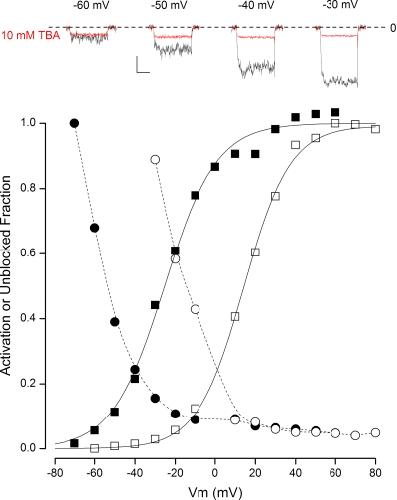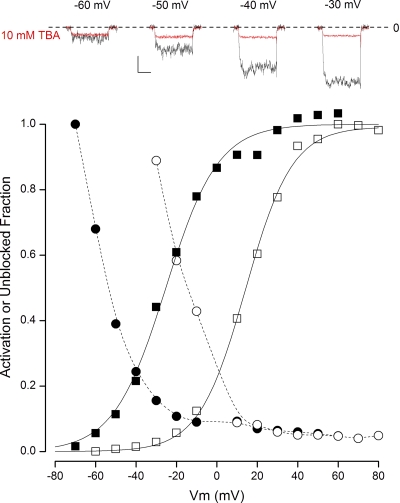 Figure 2. Open-state block of BK channels by TBA in K+ solutions. (Top insets) Time course of raw BK channel currents recorded in 100 µM Ca2+ in the absence (black) and presence (red) of 10 mM TBA at the potentials indicated. Calibration: 0.4 nA, 50 msec. The zero-current level is indicated by the dashed line. (Main) Voltage dependence of BK channel activation in 100 µM Ca2+ (■) and in 10 µM Ca2+ (□). Also shown is the voltage dependence of the fraction of channels not blocked by 10 mM TBA in 100 µM Ca2+ (•) and in 10 µM Ca2+ (○). Solid lines, fits of the Boltzmann equation to the data; dashed lines, spline fits to the data.