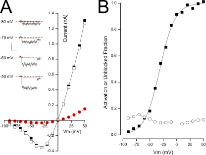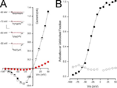 Figure 3. State-independent block of BK channels by TBA in Rb+ solutions. (A; insets) Time course of raw BK channel currents recorded in 100 µM Ca2+ in the absence (black) and presence (red) of 10 mM TBA at the potentials indicated. The voltage level before depolarization was −100 mV, and after the depolarization it was −80 mV (see Materials and methods). Calibration: 0.12 nA, 50 msec. Zero-current level indicated by dashed line. (Main) Steady-state current–voltage relation before (■), during (•), and after (□) the application of 10 mM TBA in Rb+ solutions. (B) Voltage dependence of BK channel activation (■) and fraction of channel not blocked by TBA (○) in 100 µM Ca2+.