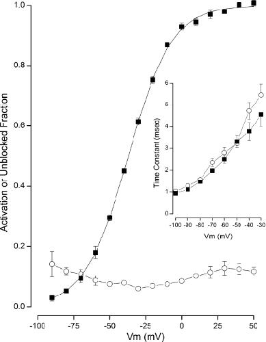 Figure 7. State-independent block of BK channels by BP in Rb+ solutions. Pooled data. Voltage dependence of BK channel activation (■) and fraction of channels not blocked by 2 µM BP (○) in 100 µM Ca2+. Mean values from four experiments shown with standard error limits if larger than symbol. (Inset) Voltage dependence of the time constant of deactivation in the absence (■) and presence (○) of the BP. Mean values from three experiments shown with standard error limits if larger than symbol.