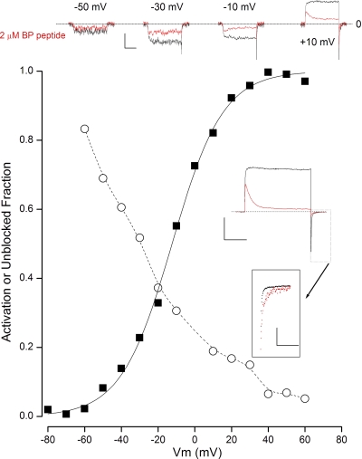 Figure 1. Open-state block of BK channels by the BP in K+ solutions. (Top inset) Time course of raw BK channel currents recorded in 100 µM Ca2+ in the absence (black) and presence (red) of 2 µM BP at the potentials indicated. Calibration: 0.4 nA, 50 msec. Zero-current level indicated by dashed line. (Main) Voltage dependence of BK channel activation (■) and fraction of channels not blocked by the BP (○) in 100 µM Ca2+. (Inset) Raw current recorded at + 60 mV from a holding potential of −80 mV in the absence (black) and presence (red) of 2 µM BP. Calibration: 2 nA, 50 msec. Zero-current level indicated by dashed line. (Boxed inset) Magnified view of the currents after repolarization to −80 mV, with the peak current in the BP scaled to match that of the control record. Calibration: 1 nA, 25 msec.