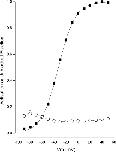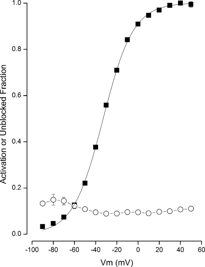 Figure 4. State-independent block of BK channels by TBA in Rb+ solutions. Pooled data. Voltage dependence of BK channel activation (■) and fraction of channels not blocked by TBA (○) in 100 µM Ca2+. Mean data shown with standard error limits if larger than symbol. Data from six to nine experiments, except n = 3 at −90 mV.