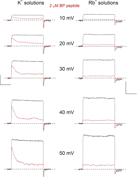 Figure 5. Time course of BP block of BK channels in K+ and Rb+ solutions. Raw currents at the indicated potentials in the absence (black) and presence (red) of 2 µM BP recorded in 100 µM Ca2+ in K+ (left; calibration: 1.2 nA, 50 msec) and Rb+ (right; calibration: 0.25 nA, 50 msec) solutions. The holding potential for the K+ solutions was −80 mV. For the Rb+ solutions, the voltage level before depolarization was −100 mV, and after the depolarization it was −80 mV. The tail currents upon repolarization have been truncated for clarity.