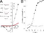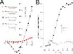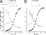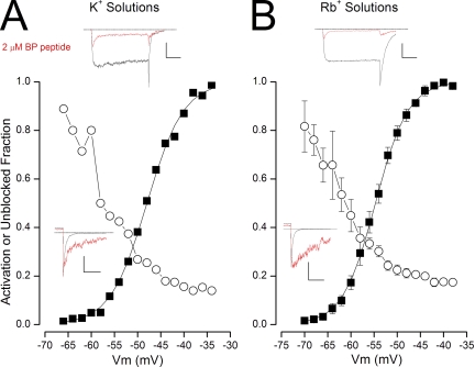 Figure 8. Open-state block of Shaker K channels by the BP in K+ and Rb+ solutions. (A) Block of Shaker channels by 2 µM BP in K+ solutions. (Top inset) Currents recorded at −40 mV from a holding potential of −100 mV in the absence (black) and presence (red) of 2 µM BP. Calibration: 0.2 nA, 100 msec. (Main) Voltage dependence of Shaker channel activation (■) and fraction of channels not blocked by 2 µM BP (○). (Inset) Shaker channel currents in response to repolarization to −100 mV (from +20 mV) in the absence (black) and presence (red) of 2 µM BP, with the peak current in the BP scaled to match that of the control record. Calibration: 0.75 nA, 20 msec. (B) Block of Shaker channels by 2 µM BP in Rb+ solutions. (Top inset) Currents recorded at −40 mV from a holding potential of −100 mV in the absence (black) and presence (red) of 2 µM BP. Calibration: 0.4 nA, 100 msec. (Main) Voltage dependence of Shaker channel activation (■) and fraction of channels not blocked by 0.5 µM BP (○). Mean values from three experiments shown with standard error limits if larger than symbol. (Inset) Shaker channel currents in response to repolarization to −120 mV (from +20 mV) in the absence (black) and presence (red) of 2 µM BP, with the peak current in the BP scaled to match that of the control record. Calibration: 1.2 nA, 20 msec. Dashed line in all insets represents the zero-current level.