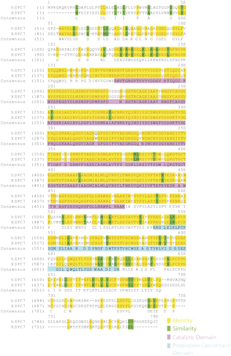 Figure 1. Sequence of SPC7.The amino acid sequence is aligned with that of human SPC7. Identities are highlighted in yellow, similarities in green, the catalytic domain in magenta, and the proprotein convertase domain in cyan.