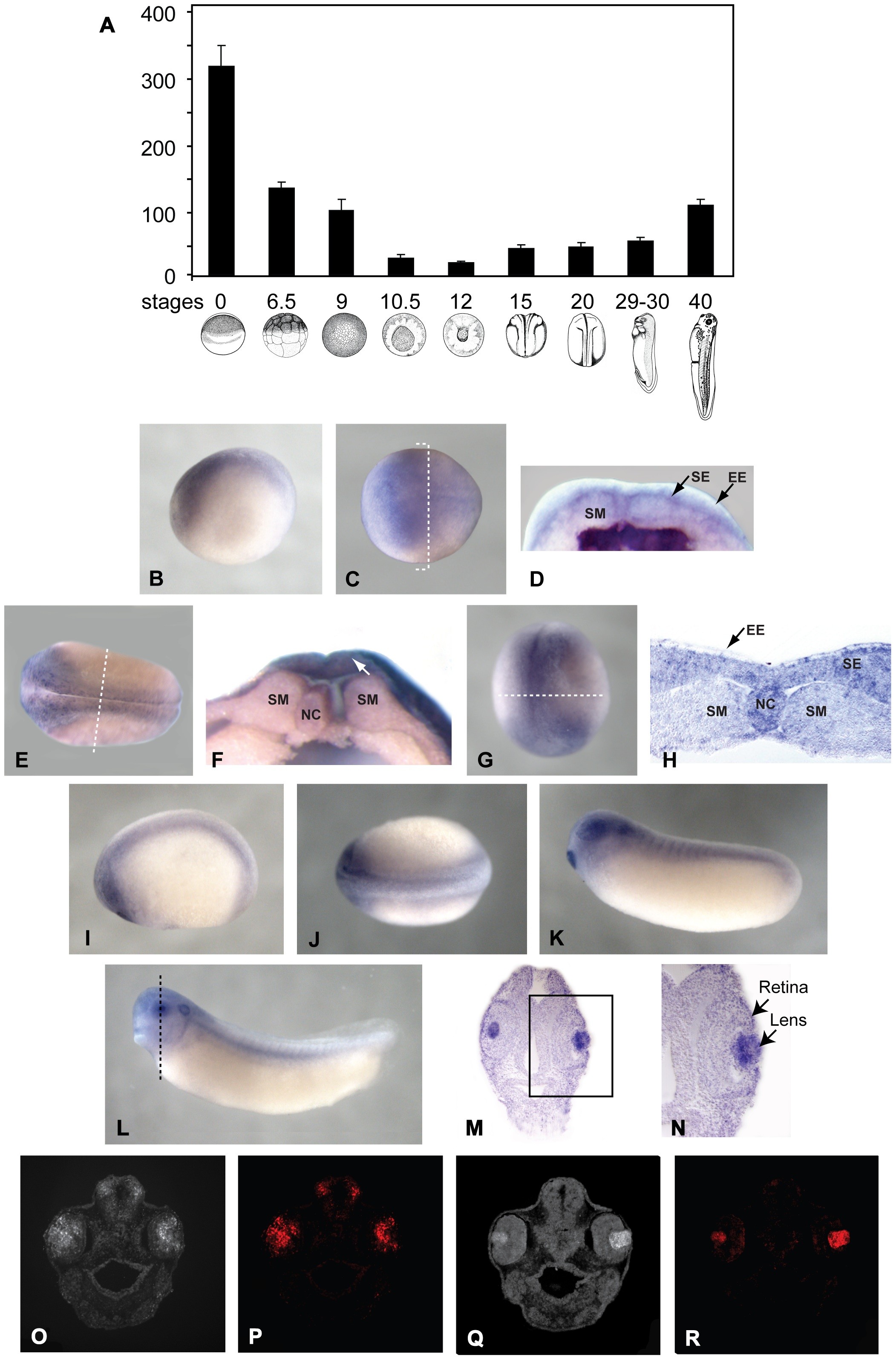 Figure 2. Expression of SPC7 mRNA in Xenopus embryos at different developmental stages. (A) Real-time PCR. (B-N) Whole mount hybridization in situ (in panels B, C, E, and I-L, anterior is to the left. Dotted lines in C, E, G, and L indicate the approximate plane for images in D, F, H, and M, respectively). (B-C) Lateral (B) and dorsal (C) views of a stage 13 embryo showing staining in the early neural plate. (D) Hemisected stage 13 embryo displaying detectable expression of SPC7 in the sensorial layer of the neuroectoderm, but not in the underlying somitogenic mesoderm. (E) Dorsal view of stage 16 embryo showing SPC7 staining in the neural folds and presumptive eye field. (F) hemisected midneurula (stage 16) showing staining in the sensorial ectoderm (arrow). (G) Antero-dorsal view of a late neural fold (stage 18) embryo showing staining in the anterior part of neural plate and anterolateral edges. (H) Plastic section through over-stained embryo showing staining in neuroectoderm. Lateral (I) and dorsal (J) views of a stage 212 embryo showing prominent staining in the eye, cement gland, brain, and neural tube. (K) Lateral view of stage 26 embryo showing SPC7 expression in the retina, lens, cement gland, otic vesicle, and throughout the head and somites. (L) At stage 32, staining in the lens became more prominent, primarily because expression in the retina decreased substantially. (M) Plastic section of over-stained stage 35 embryo showing specific SPC7 localization in the lens. (N) Enlarged view of boxed area shown in M. (O-R) Stage 302 (O, P) and stage 357 (Q, R) paraffin sections analyzed for SPC7. (O) Total fluorescence. (P) Same section as in O showing specific SPC7 staining in retina and lens (Fast Red). (Q) Total fluorescence. (R) Same section as in Q showing specific SPC7 fluorescent staining localized to the lens. (NC = Notochord; EE = Epithelial Layer of Neuroectoderm; SE = Sensorial Layer of Neuroectoderm; SM = Somitogenic Mesoderm).