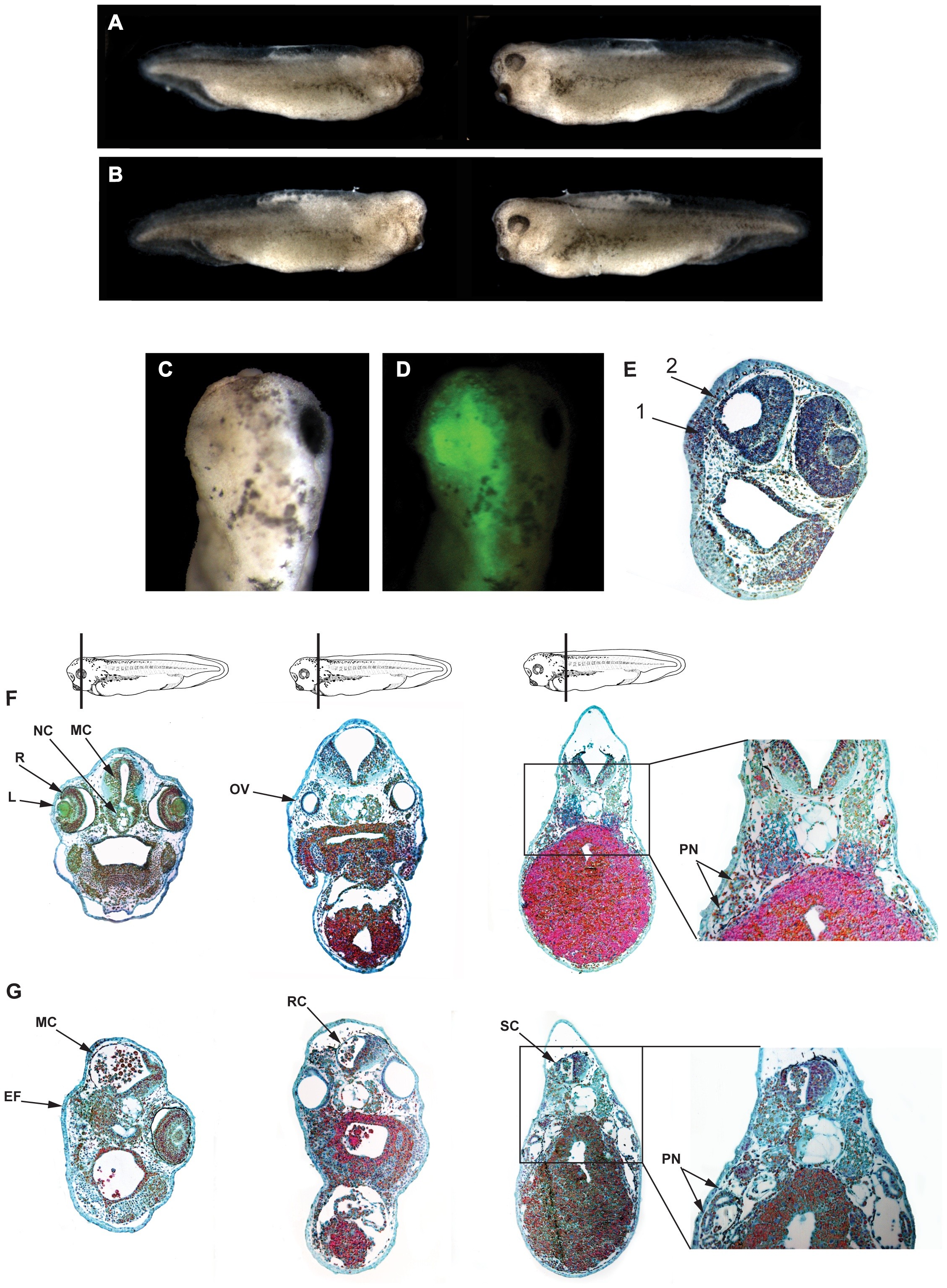 Figure 3. SPC7 antisense morpholino oligonucleotide causes dose-dependent disruption of eye and brain development. (A, B) Embryos injected unilaterally with antisense SPC7-MO at the two cell (A) or four cell stage (B). Injected side is shown on the left. Both the two cell and four cell stage loss-of-function SPC7 experiments resulted in the same phenotype: lack of eye, lack of branchial arches, and diminished head structures on the MO-injected side. The morphology of the rest of the embryo appeared normal. (C) Dorsal view of tadpole-stage embryo injected at the four cell stage with 90 ng MO; the eye appears to be completely absent on the injected side. (D) Same embryo as in C showing MO location on the left. (E) Frontal section of embryo in C and D showing total loss of eye and mesencephalon on the SPC7-MO injected side. The uninjected side was unaffected. Arrows 1 and 2 show presumptive eye field and mesencephalon, respectively, on the MO injected side. In each experiment, embryos injected with control MO developed normally (not shown). (F, G) Histological analysis of control-MO injected (F) and SPC7-MO unilaterally-injected (G, injected side to the left) stage 35 embryos. The planes of section presented are shown diagrammatically at the top. As noted previously, the eye and brain are severely dysmorphic on the injected side; the otic vesicle and pronephros appear normal. (L = Lens; R = Retina; NC = Notochord; MC = Mesencephalon; RC = Rhombancephalon; SC = Spinal Cord; OV = Otic Vesicle; PN = Pronephros; EF = Eye Field).