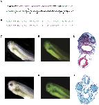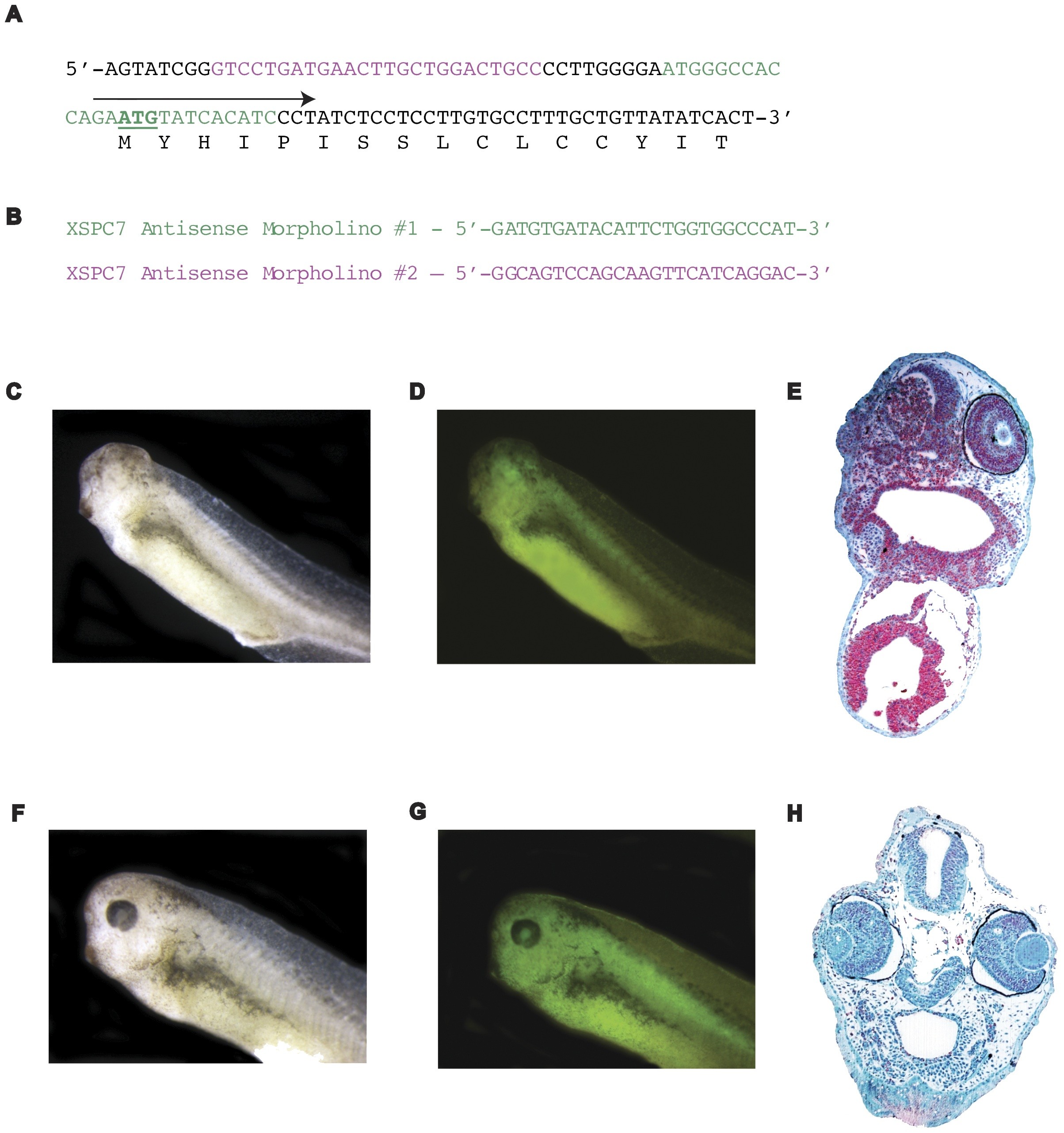 Figure 4. 5â² sequence of SPC7. (A) 5â² sequence of SPC7 and antisense morpholino oligonucleotides. Sequences corresponding to SPC7 MOs 1 and 2 are shown in green and magenta, respectively. Start codon is underlined. Arrow denotes 5â² primer used to construct synthetic mRNA used in rescue experiments. (B) Sequences of antisense morpholino oligonucleotides. (C, D) Bright and dark field images of stage 37 SPC7 antisense morpholino-only control embryo showing anophthalmic SPC7-MO phenotype on injected side. (E) Histological section through SPC7-MO embryo; note lack of distinguishable eye structures on the injected side and severe mesencephalic hypoplasia. (F, G) Bright and dark field images of stage 37 embryo coinjected with SPC7 antisense morpholino oligonucleotides and synthetic rescue mRNA, showing normal morphology on the injected side. For all rescue experiments, we used the 90 ng dose. Complete rescue as shown in (F-H) was observed in all embryos in each of three separate experiments (106 total embryos were scored); identical results were obtained with either SPC7-MO. (H) Histological section through coinjected embryo; both eyes appear normal.