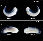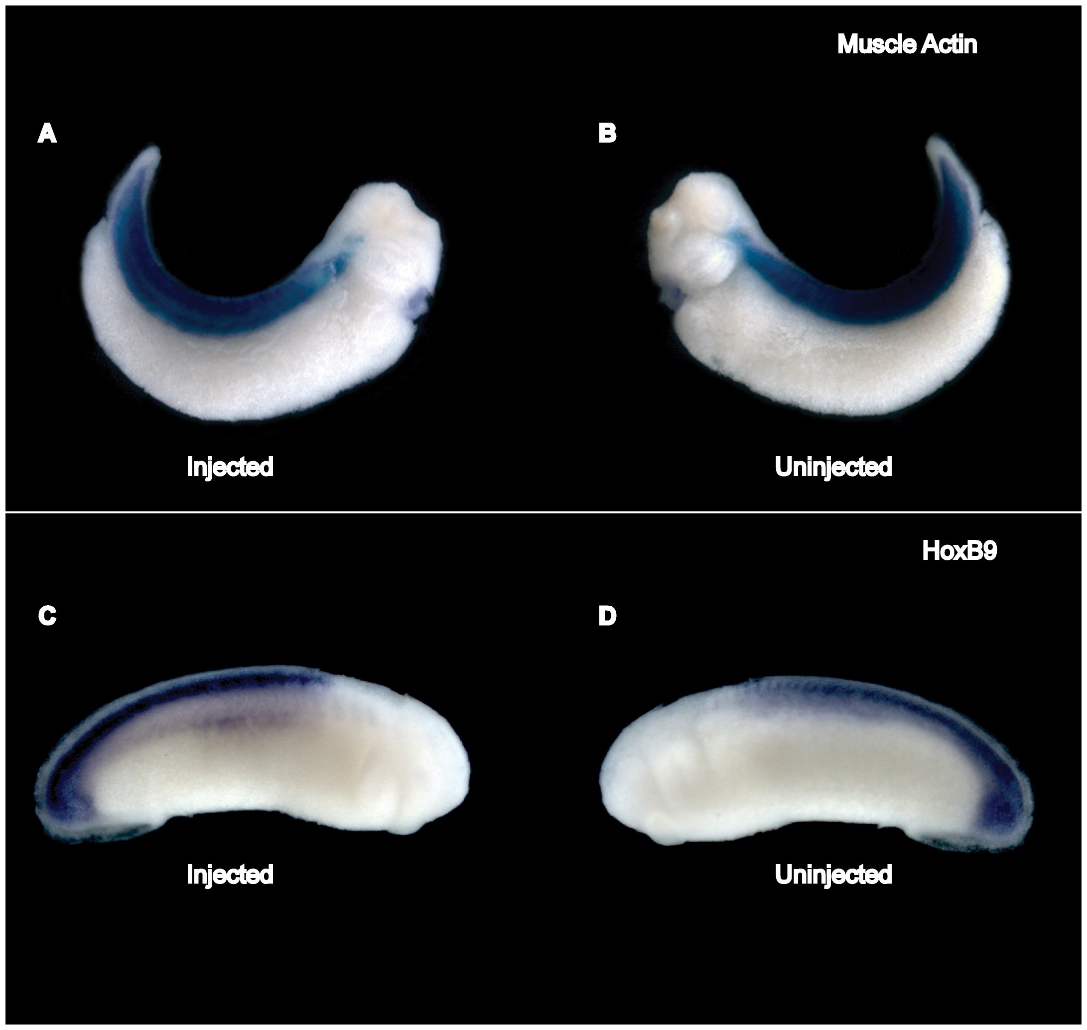 Figure 5. Loss of SPC7 function does not affect mesodermal and posterior neuroectodermal marker expression patterns. Whole mount hybridization in situ of embryos injected unilaterally with 90 ng SPC7 morpholino. Injected sides are shown to the left. (A, B) Lateral views of stage 35 embryo showing that muscle actin (dorsal mesoderm) staining was equally visible in both the injected and uninjected sides of the embryo. (C, D) Lateral views showing that HoxB9 (posterior neuroectoderm) expression was equally apparent in the posterior dorsal region of the embryo in both the injected and uninjected sides.